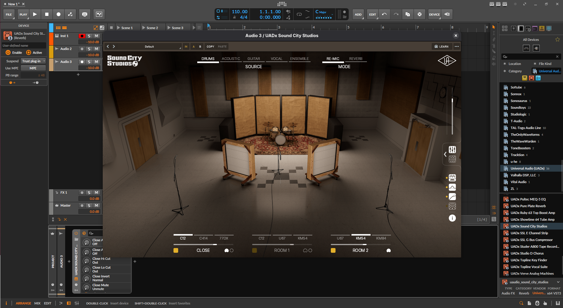 A screenshot from the DAW Bitwig on a Linux machine, showing a windows plugin from Universal Audio run through Yabridge and Wine.