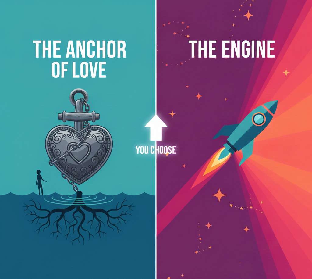 Graphic comparing the "ANCHOR" concept (love as burden/chains) to the "ENGINE" concept (love as an exponential power source).