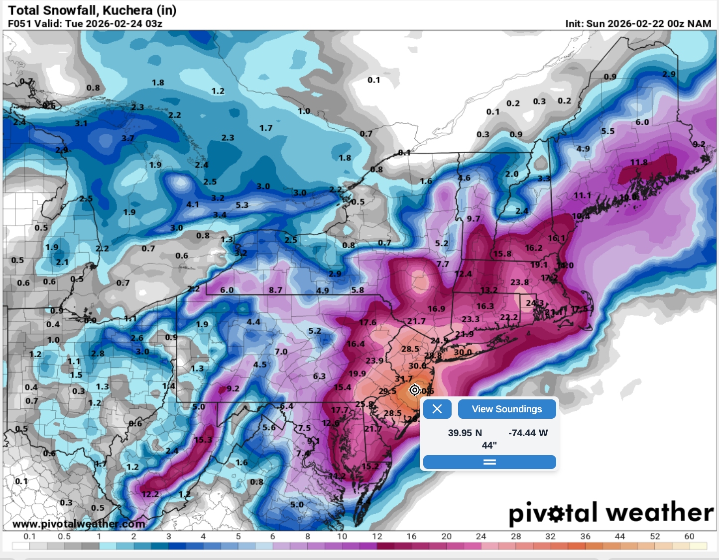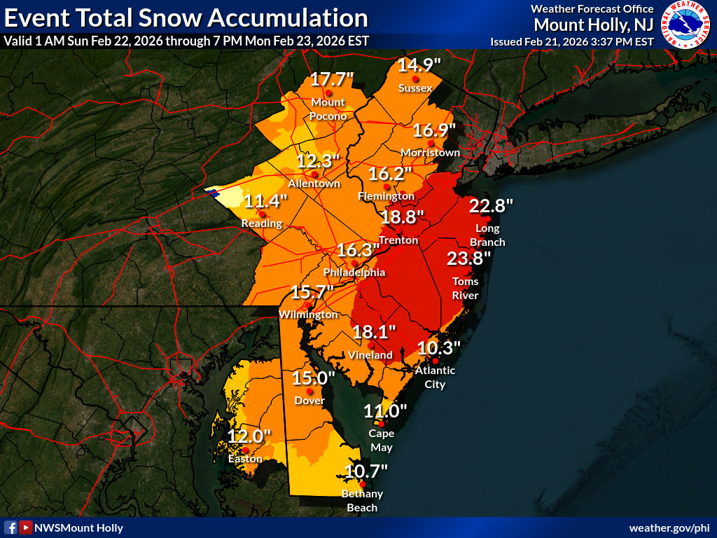 Just saw a hi-res look at the NAM 3K snow map...there's an area of 30"+ snowfall through northern Ocean County, NJ. And while Trenton-Mercer comes in at 20.2", verbatim, a few miles east where I am is at 23". That's my target number, as I remember measuring 22" as a kid during the Blizzard of '78.