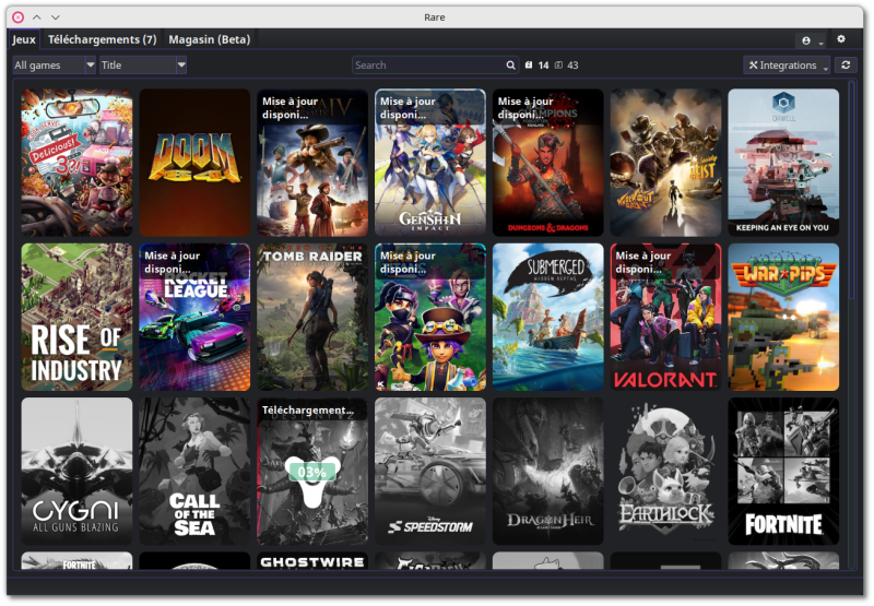 📚️ Rare is a libre, multi-platform interface for the Epic Games Store, enabling you to install, uninstall and launch your games - via Legendary (a command-line tool adding a layer of compatibility with this store). It enables authentication on the store, installation on hard disk or in the cloud, updating and setting up Wine and games, searching for information on ProtonDB, checking games and repairing them if necessary. Its interface provides an immediate overview of your game library (installed/uninstalled games, installation progress), plus filters to make searching easier. An excellent tool!