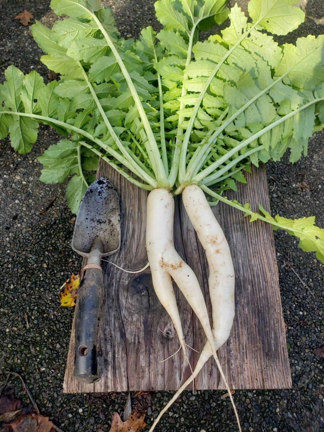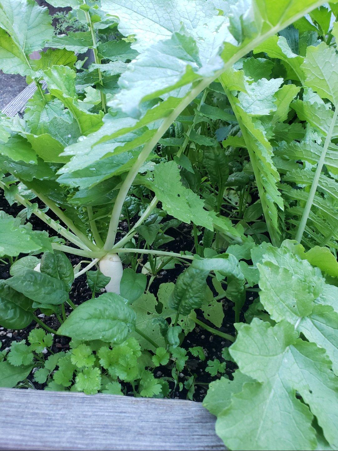 ... and best of all, in the sunny locations the radishes grew quite a lot! As you can see, the variety that made it was the Daikon type. We've been having many tasty soups these winter. The roots are quite strong, but the leaves are so good. Even Little Kid (who is not very adventurous in trying new flavors) gave them a try.