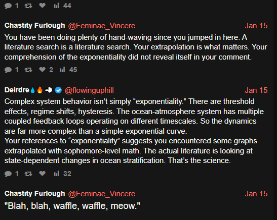 i just have to reflect on a thing i just have seen, which is the part of my #climate bubble (which are #scientists, among them one complexity scientist) still with their account on #X effing debating to "bring back science on #X" to then proceed debate with an obvious bot for an hour straight.