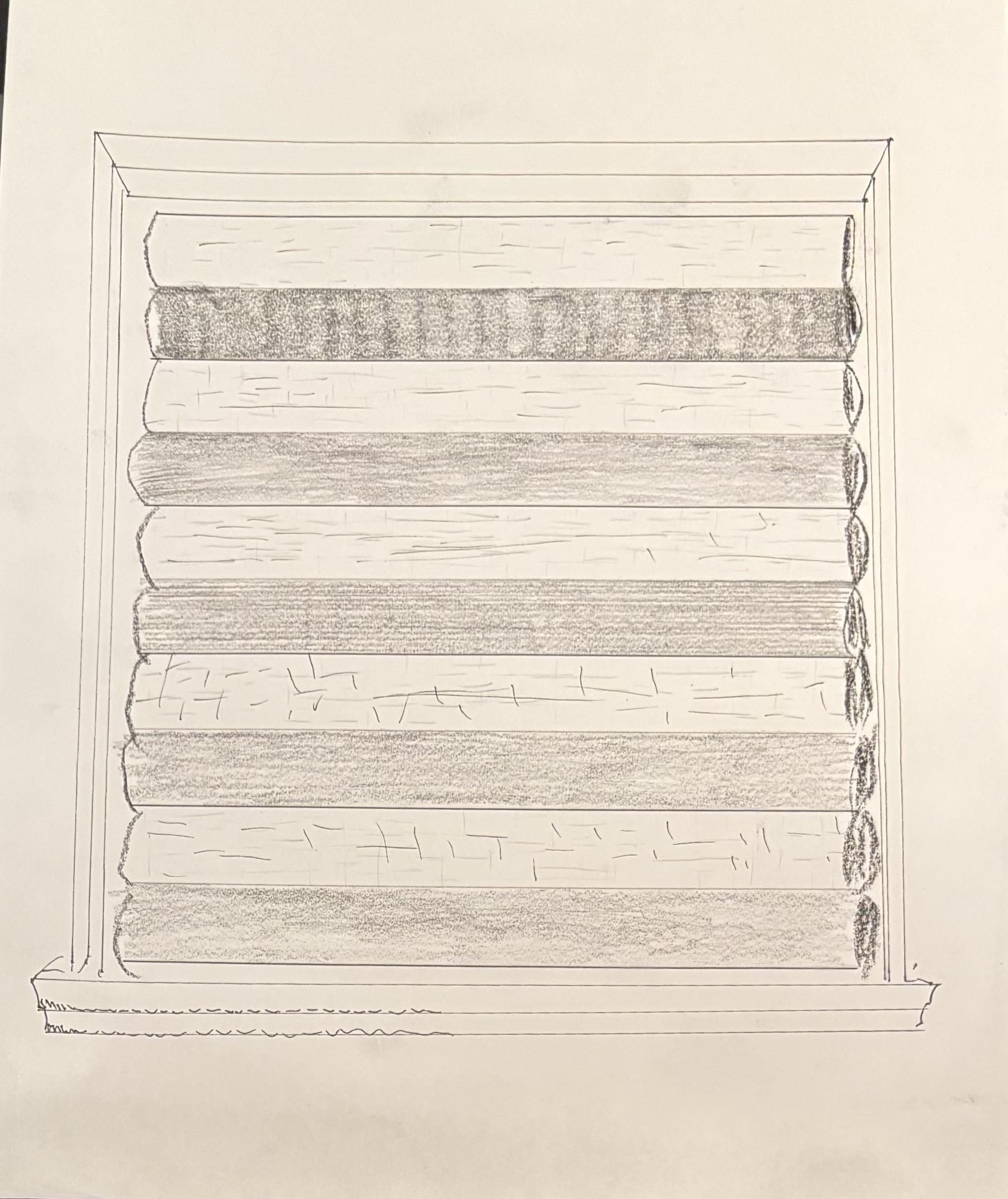 A sketch on white paper of a Venetian style blind in a window. Each row alternates between white with light grey and black thatching and grey with a few different textures