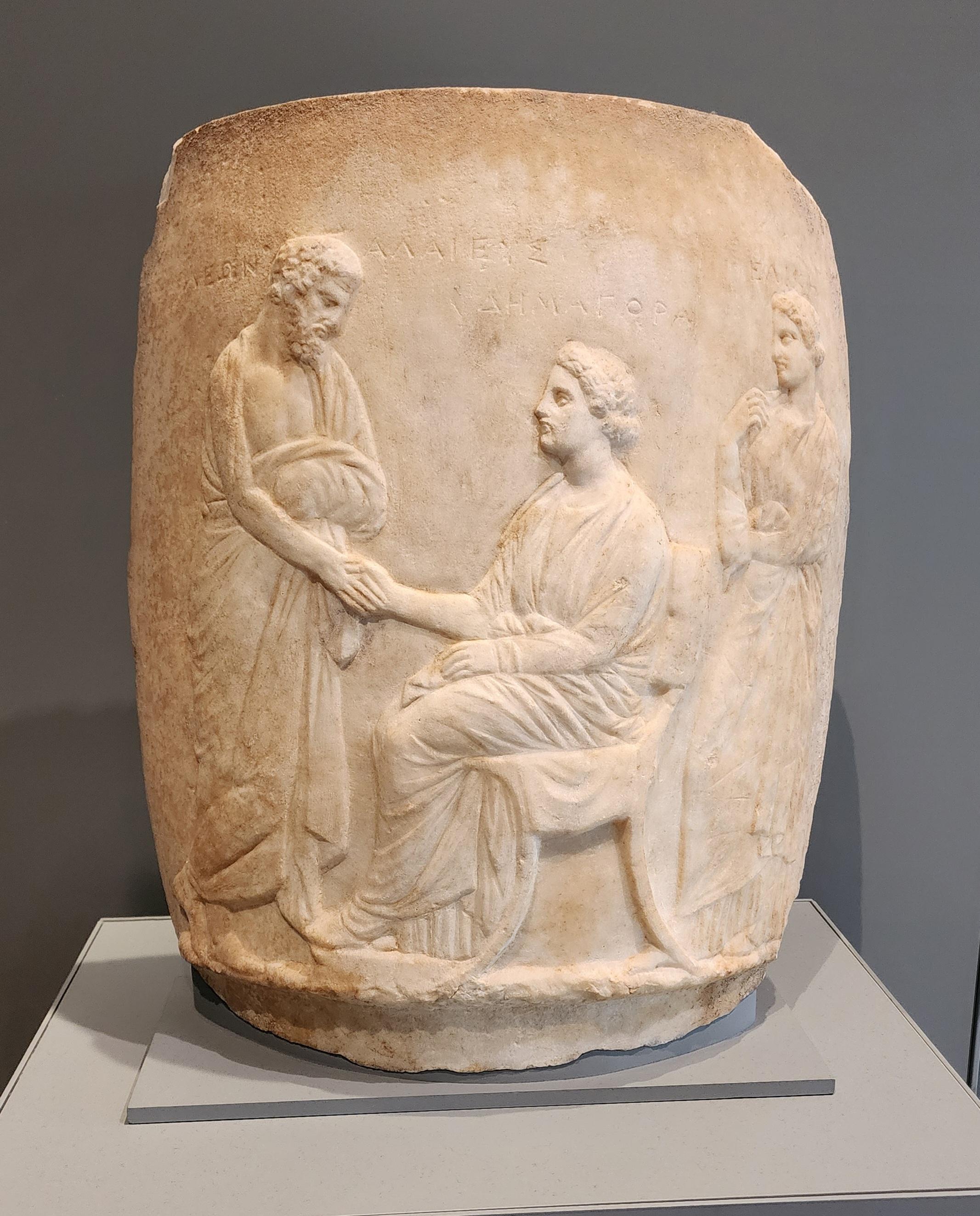 Cylindrical block of marble carved in relief, depicting a seated woman in Greek garb, facing left and holding hands with a man, standing, also in Greek attire. Behind the seated woman stands another woman looking on. There are Greek inscriptions above the figures, naming them as Demagora (seated), Leon, and Helike.