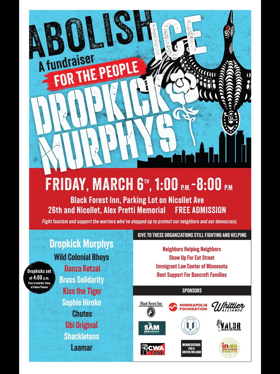 Concert Poster Reads: Abolish ICE A fundraiser for the people FRIDAY, MARCH 6th, 1:00 PM to 8:00 PM Black Forest Inn, Parking Lot on Nicollet Ave 26th and Nicollet, Alex Pretti Memorial FREE ADMISSION Fight fascism and support the warriors who've stepped up to protect our neighbors and our democracy. GIVE TO THESE ORGANIZATIONS STILL FIGHTING AND HELPING Neighbors Helping Neighbors Show Up for EAT Street Immigrant Law Center of Minnesota Rent Support for Bancroft Families Concert line-up: Dropkick Murphys set at 4:00 PM Wild Colonial Bhoys Danza Ketzal Brass Solidarity Kiss the Tiger Sophie Hiroko Chutes Obi Original Shackletons Laamar Sponsors Black Forest Inn Minneapolis Foundation Whittier Alliance (Among others)