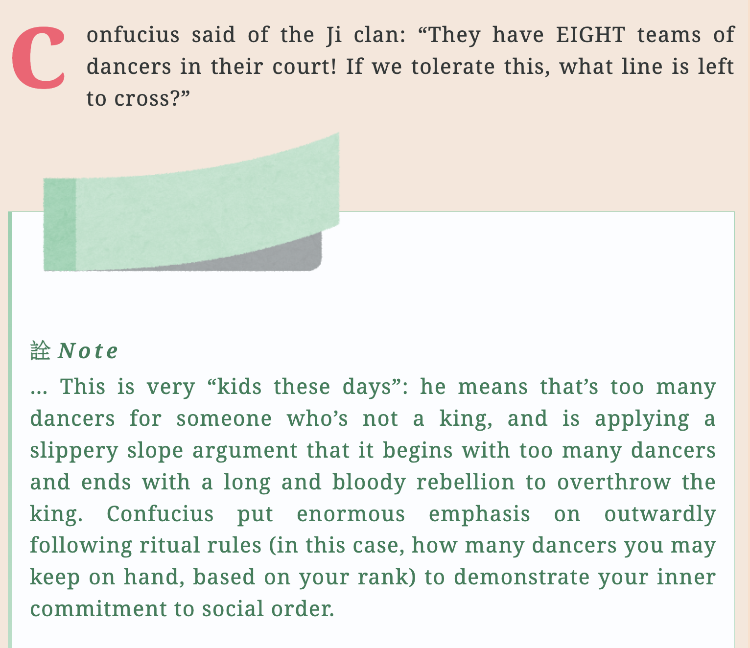 The Master remarked “Prime Minister Guan Zhong had a really small ‘jug,’ if you know what I mean!” Someone guessed: “… You mean he was frugal?” Confucius scoffed.