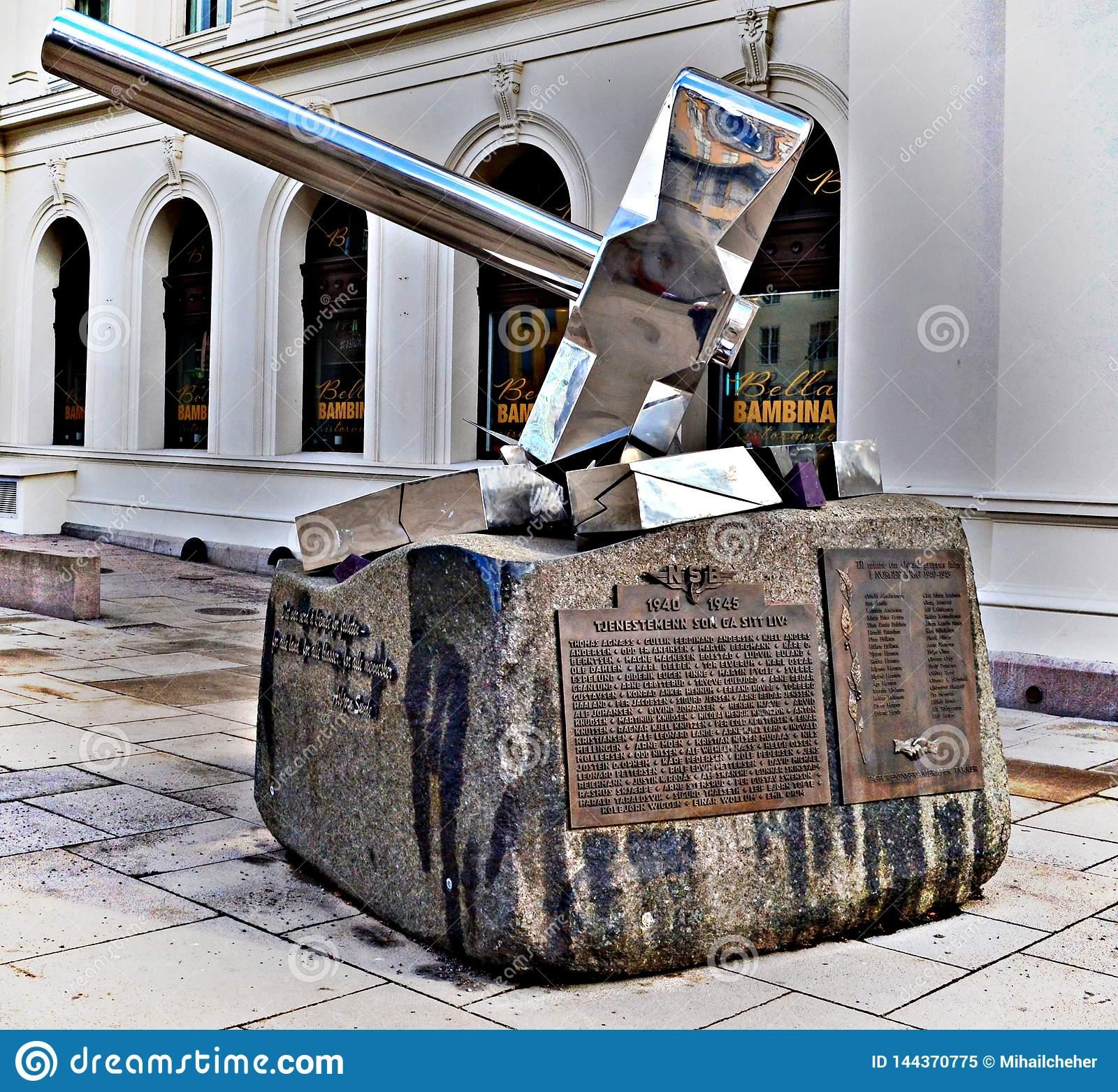 Statue outside the Central Station, Oslo, is entitled Smash Naziism by Bjorn Gulliksen, depicts a hammer smashing a swastika. It is dedicated to the Osvald Group, heroes of Norwegian Resistance during WWII.