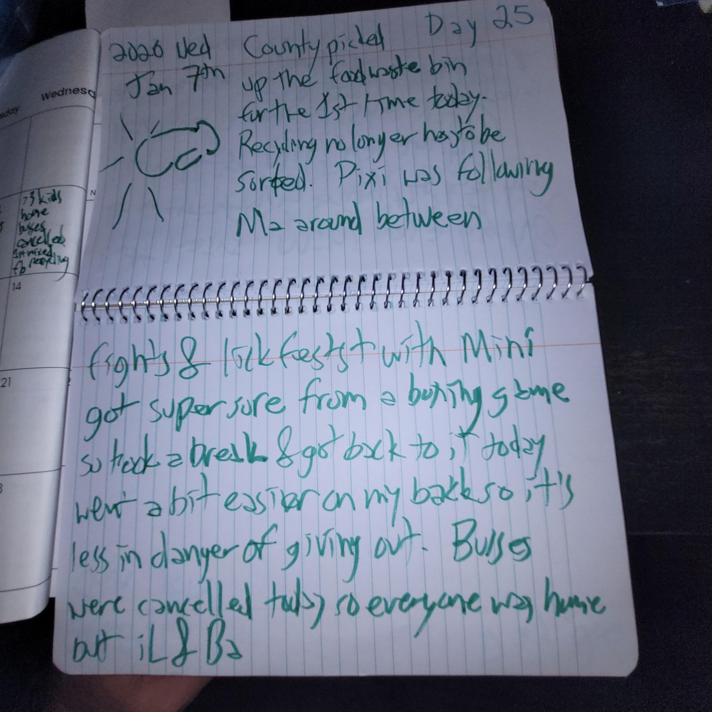 (illustration of a boxing glove impact) County picked up the food waste bin for the 1st time today. Recycling no longer has to be sorted. Pixi was following Ma around between fights & lickfests with Mini got super sore from a boxing game so i took a break & got back to it today went a bit easier on my back so it's less in danger of giving out. Busses were cancelled today so everyone was home but iL&Ba