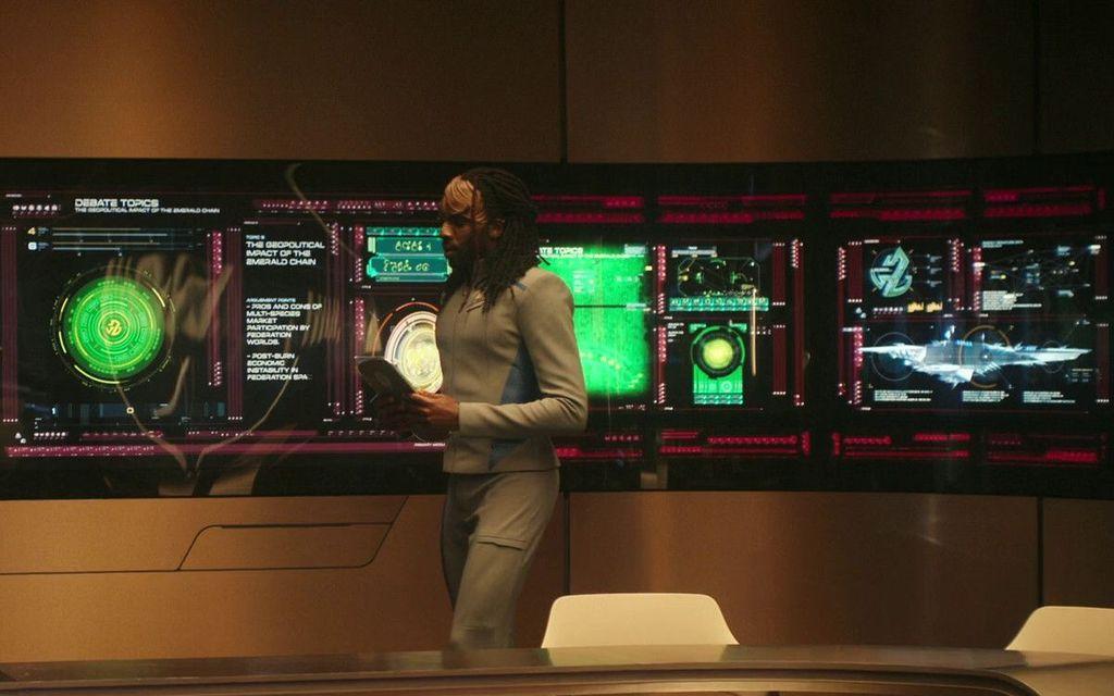 One of the possible debate topics in #StarfleetAcademy's "Vox in Excelso" is "The Geopolitical Impact of the Emerald Chain", as can be seen in this graphic. It features the Emeral Chain emblem, some Orion writing and a side view of Osyraa's ship, the Viridian, all from season 3 of #StarTrekDiscovery.