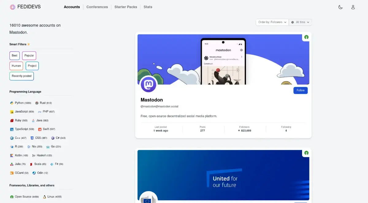 Fedidevs is a directory of Mastodon accounts, designed to help users discover and follow interesting profiles. It lists over 16,000 accounts and provides a range of tools to filter and sort them.