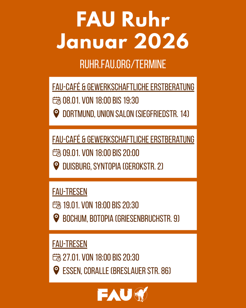Die Überschrift lautet "FAU Ruhr, Januar 2026." Darunter steht "ruhr.fau.org/termine." Darunter sind vier Kästen mit folgenden Terminen: 1. FAU-Café & Gewerkschaftliche Erstberatung, 08.01. von 18:00 bis 19:30, Dortmund, Union Salon (Siegfriedstr. 14) 2. FAU-Café & Gewerkschaftliche Erstberatung, 09.01. von 18:00 bis 20:00, Duisburg, Syntopia (Gerokstr. 2) 3. FAU-Tresen, 19.01. von 18:00 bis 20:30, Bochum, Botopia (Griesenbruchstr. 9) 4. FAU-Tresen, 27.01. von 18:00 bis 20:30, Essen, Coralle (Breslauer Str. 86)