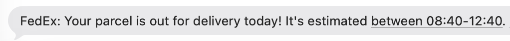 FedEx: Your parcel is out for delivery today! It's estimated between 08:40-12:40.