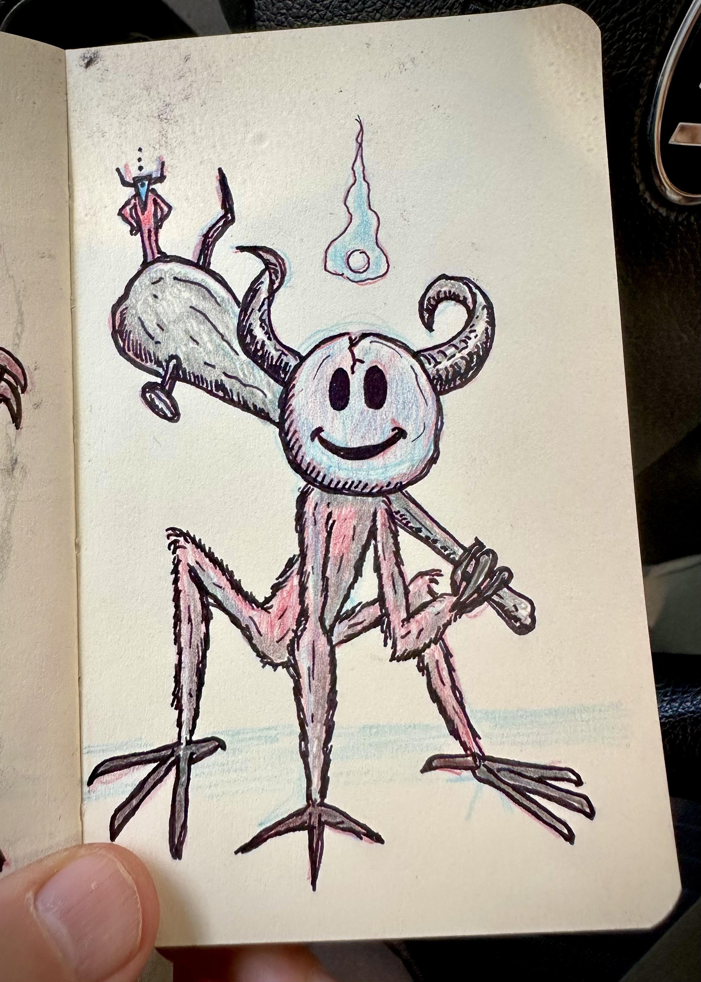 Sketchbook page wits a drawing of a crouching hairy demon, wearing a cracked happy face mask and carrying a huge club with a nail in it over its shoulder.
