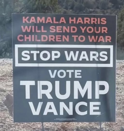 Political campaign sign from the 2024 election: Kamala Harris will send your children to war STOP WARS Vote Trump/Vance