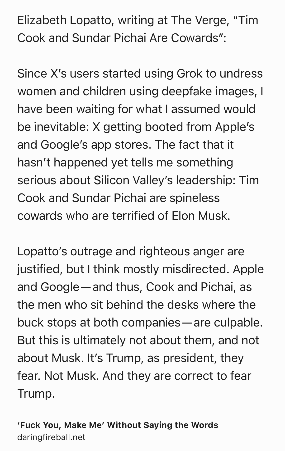 Lopatto’s outrage and righteous anger are justified, but I think mostly misdirected. Apple and Google — and thus, Cook and Pichai, as the men who sit behind the desks where the buck stops at both companies — are culpable. But this is ultimately not about them, and not about Musk. It’s Trump, as president, they fear. Not Musk. And they are correct to fear Trump.