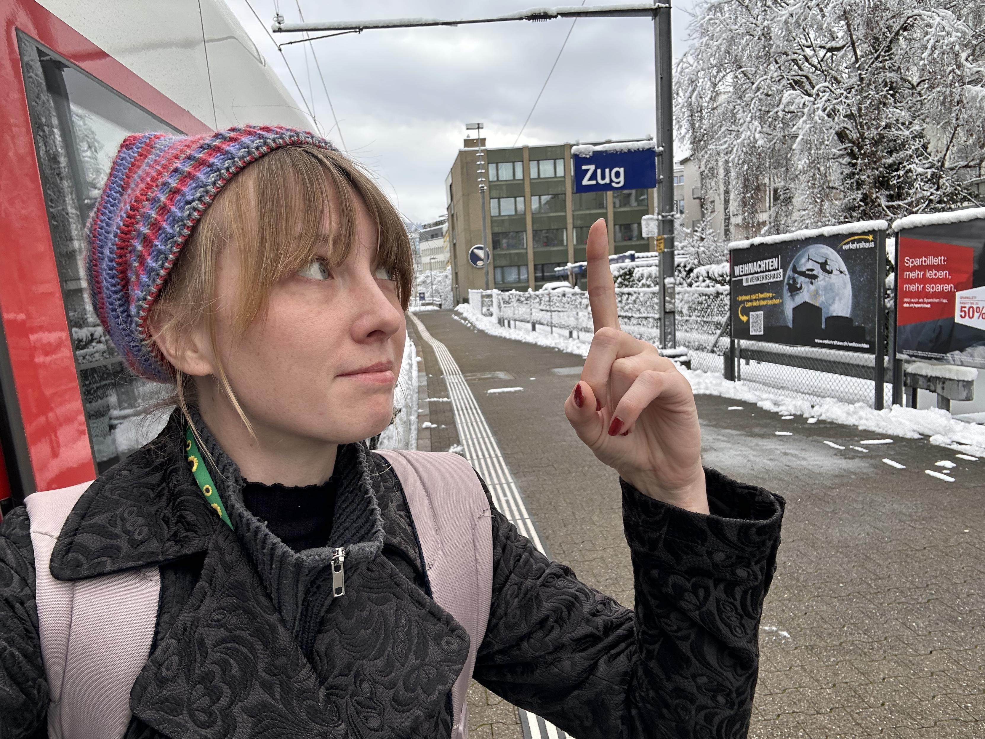 Me on the platform of Zug, next to my train. I'm pointing at a sign that says "Zug", and looking at it. I'm wearing a pink-and-purple slouchy beanie and a black coat. My blonde bangs are hanging flat due to beanie.