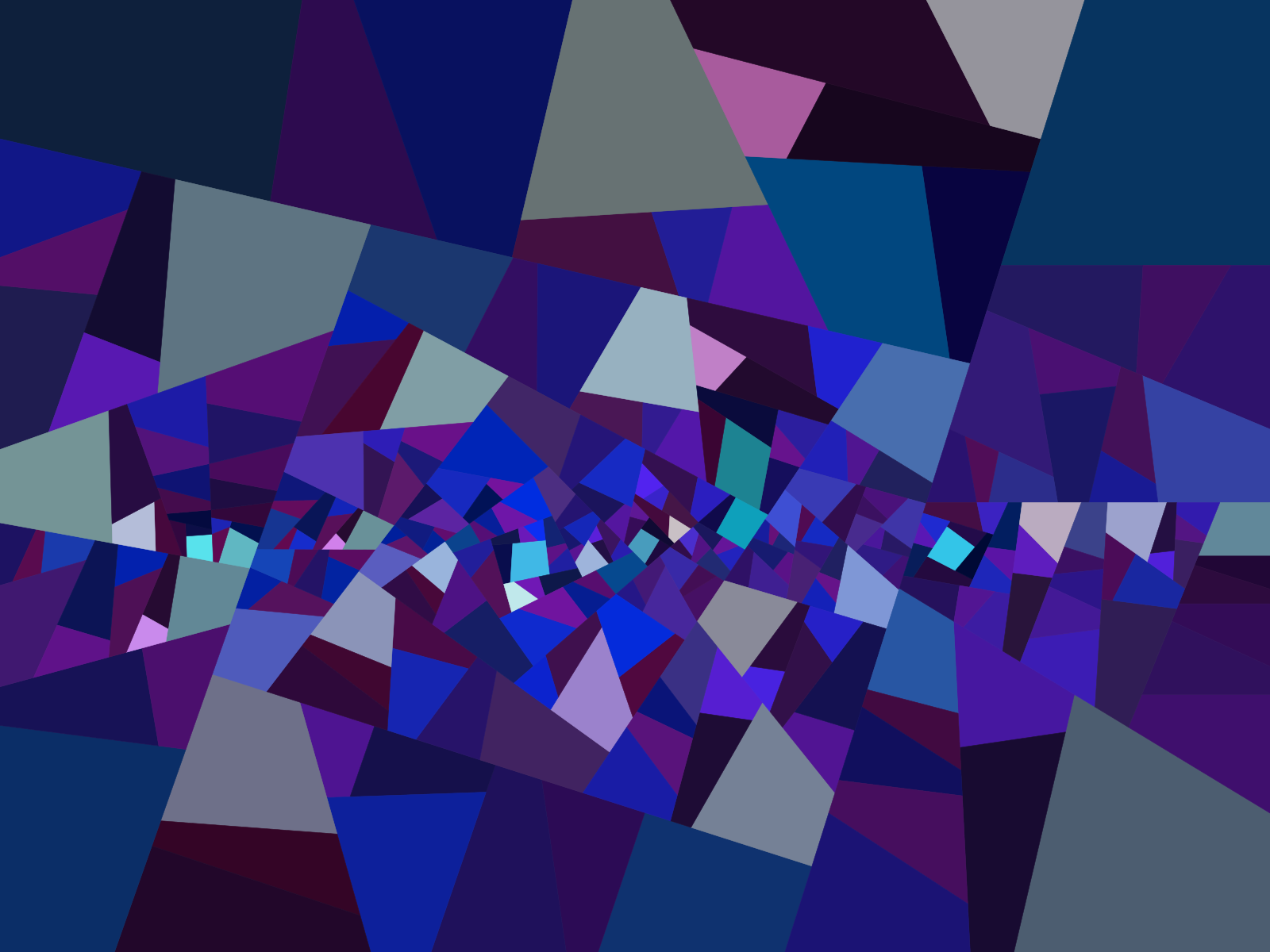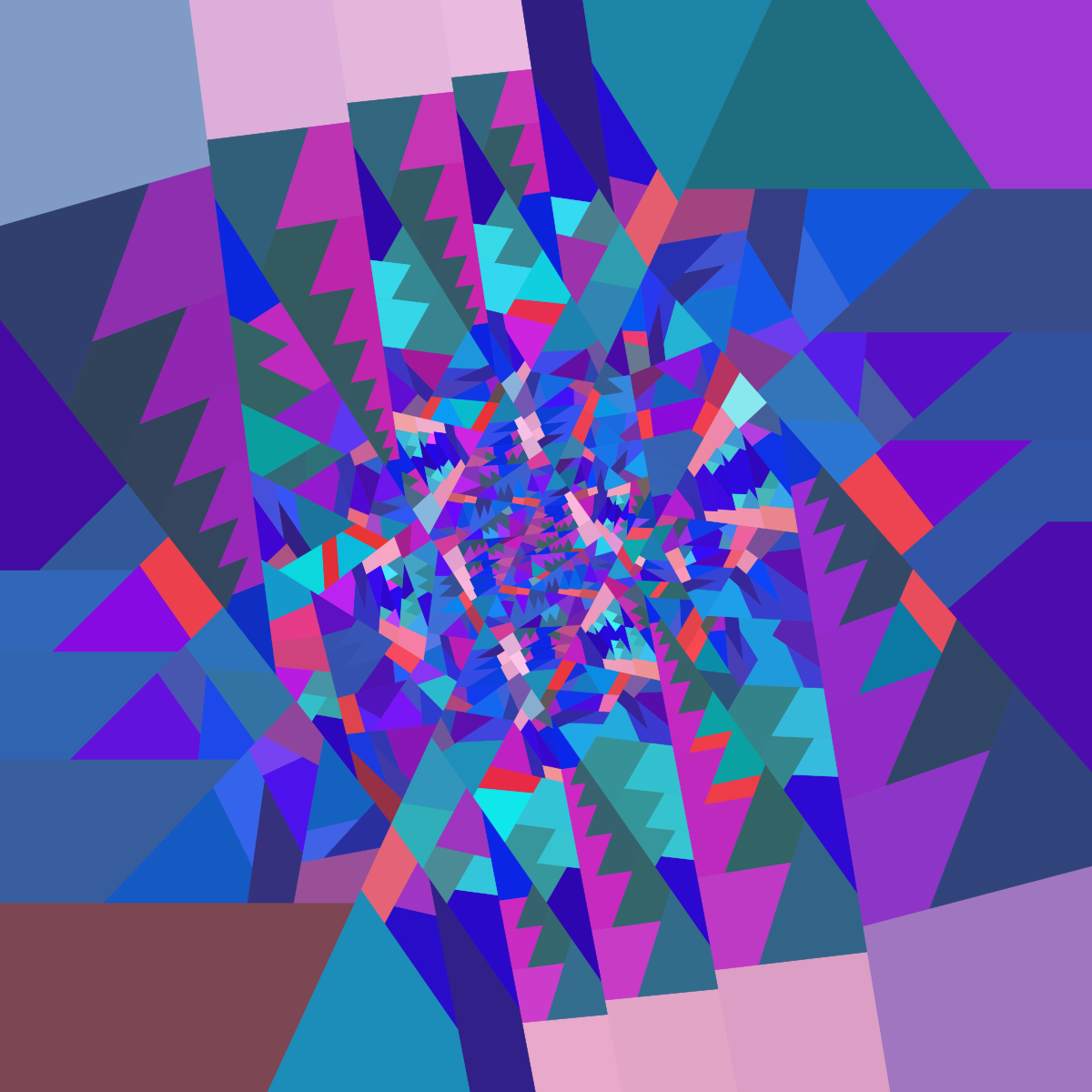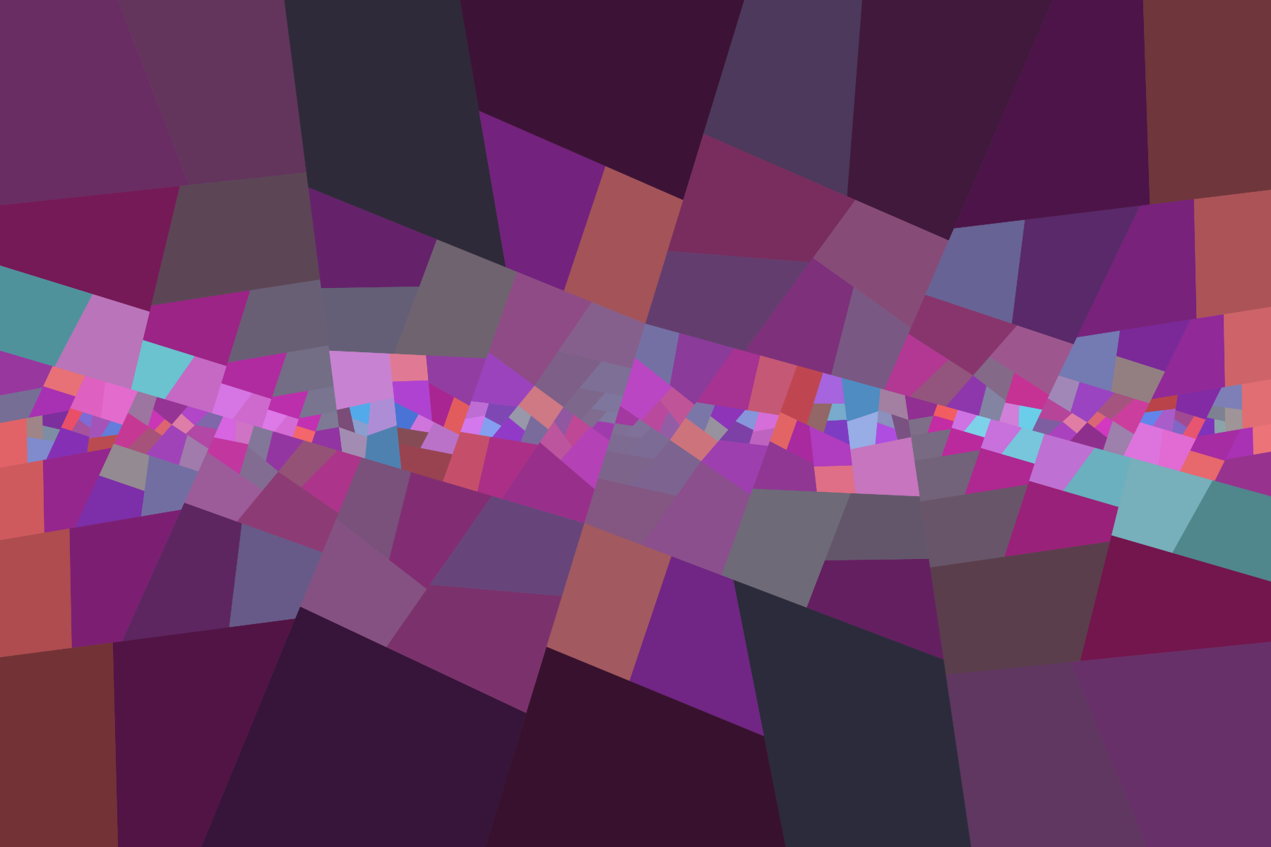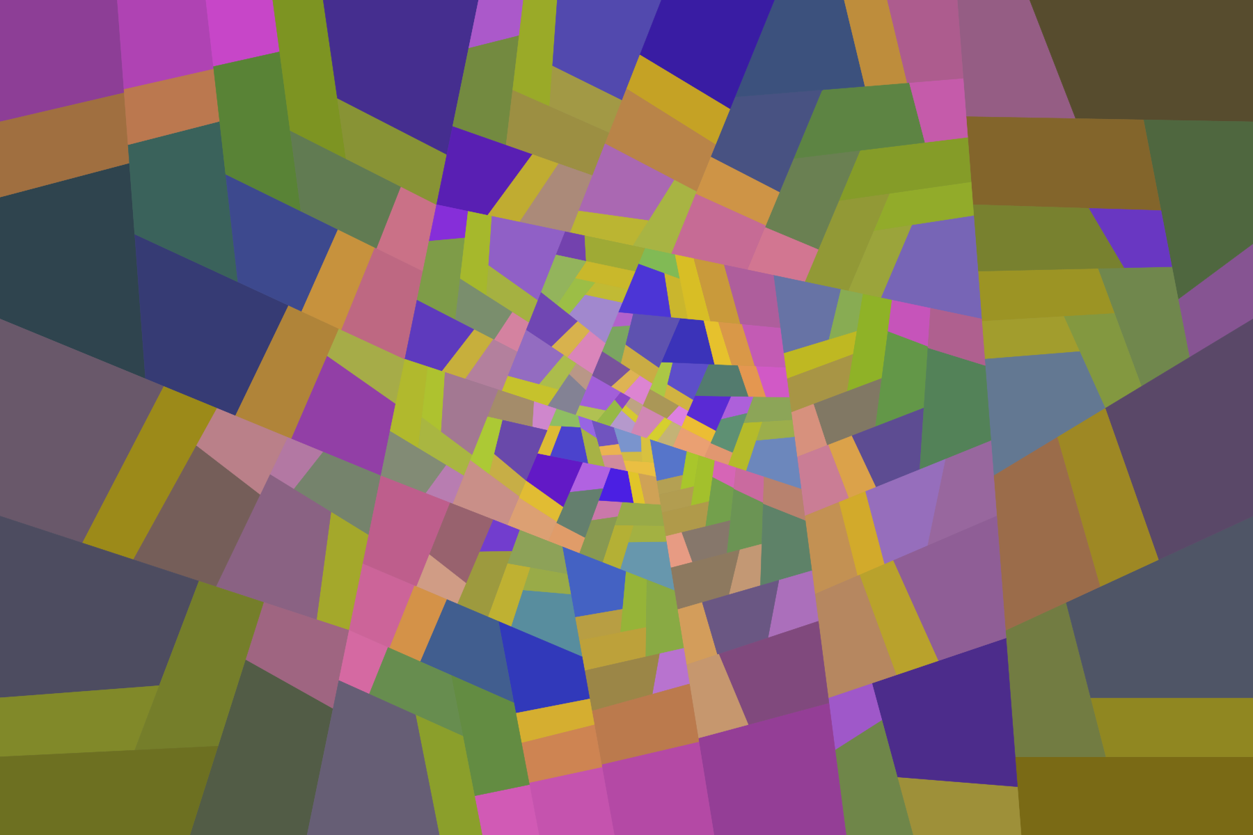 I have devised a new algorithm for #tiling, this time not restricted to rectangles, but for general convex quadrilaterals. Starting from a convex quadrilateral, divide it in two, by splitting the pair of longest opposite sides into two fixed proportions (one for the larger side, one for the smaller), joining the cutting points with a segment, and iterating recursively. Some of the artworks I got, by stopping recursion depending on the position of the quadrilateral on the canvas. In these artworks, the colour of each quadrilateral is assigned depending on its shape (relative size of its sides, and sometimes of its diagonals), with absolute size affecting brightness as well. Colours in each artwork depend as well on how each computed value is assigned to RGB values, but even when it is the same, as in the first and second pictures, results are quite different when generated quadrilaterals are. Titles of these works are "Precious walk", "Jam session", "Visit to the flower garden", and "Life paths".