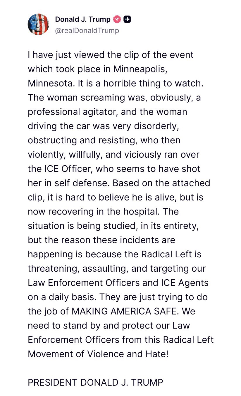 Trump post: I have just viewed the clip of the event which took place in Minneapolis, Minnesota. It is a horrible thing to watch. The woman screaming was, obviously, a professional agitator, and the woman driving the car was very disorderly, obstructing and resisting, who then violently, willfully, and viciously ran over the ICE Officer, who seems to have shot her in self defense. Based on the attached clip, it is hard to believe he is alive, but is now recovering in the hospital. The situation is being studied, in its entirety, but the reason these incidents are happening is because the Radical Left is threatening, assaulting, and targeting our Law Enforcement Officers and ICE Agents on a daily basis. They are just trying to do the job of MAKING AMERICA SAFE. We need to stand by and protect our Law Enforcement Officers from this Radical Left Movement of Violence and Hate! PRESIDENT DONALD J. TRUMP