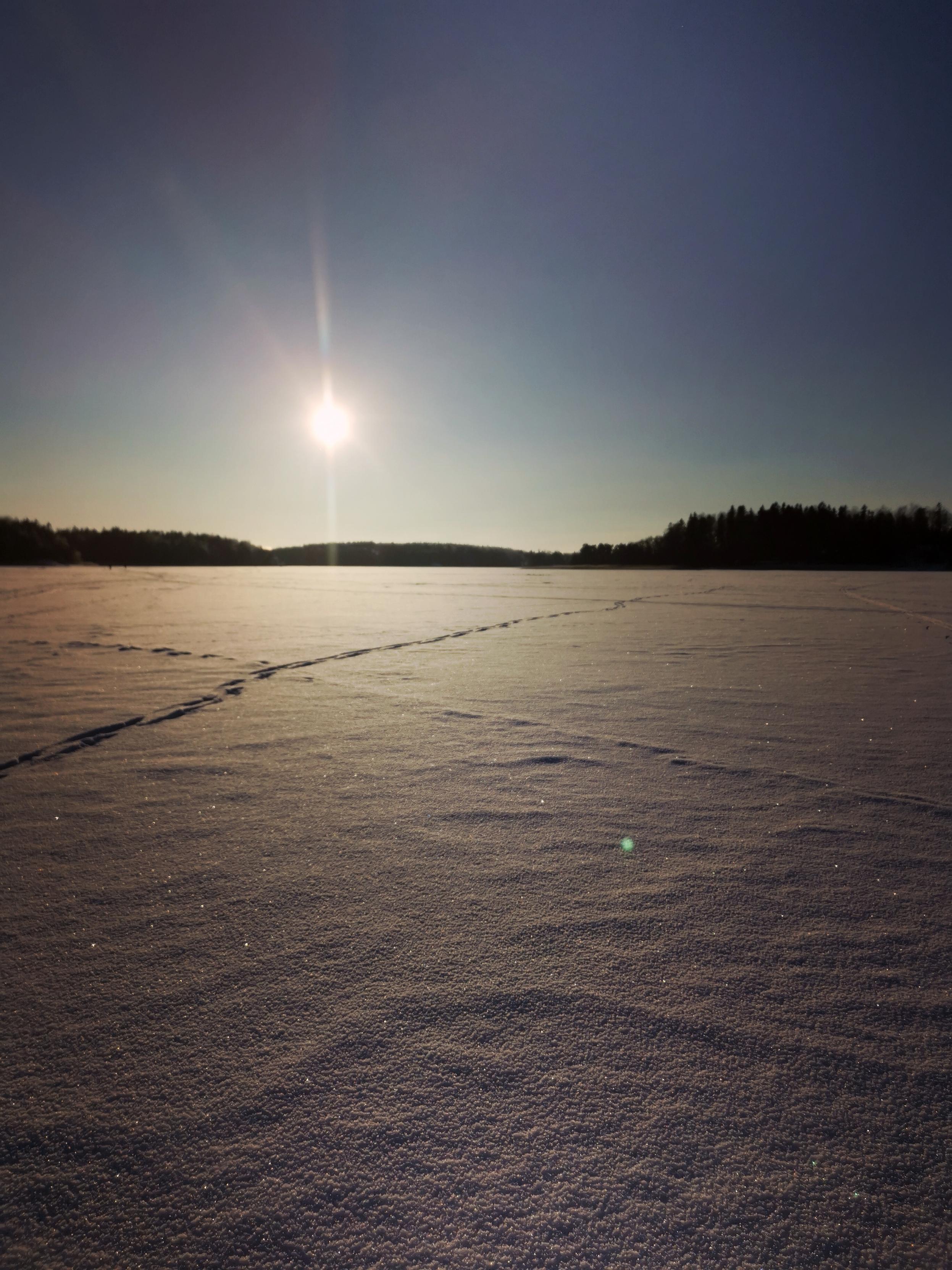 Aurinko paistaa siniseltä taivaalta lumen peittämän merenjään yllä. Lumi kimaltelee auringossa.