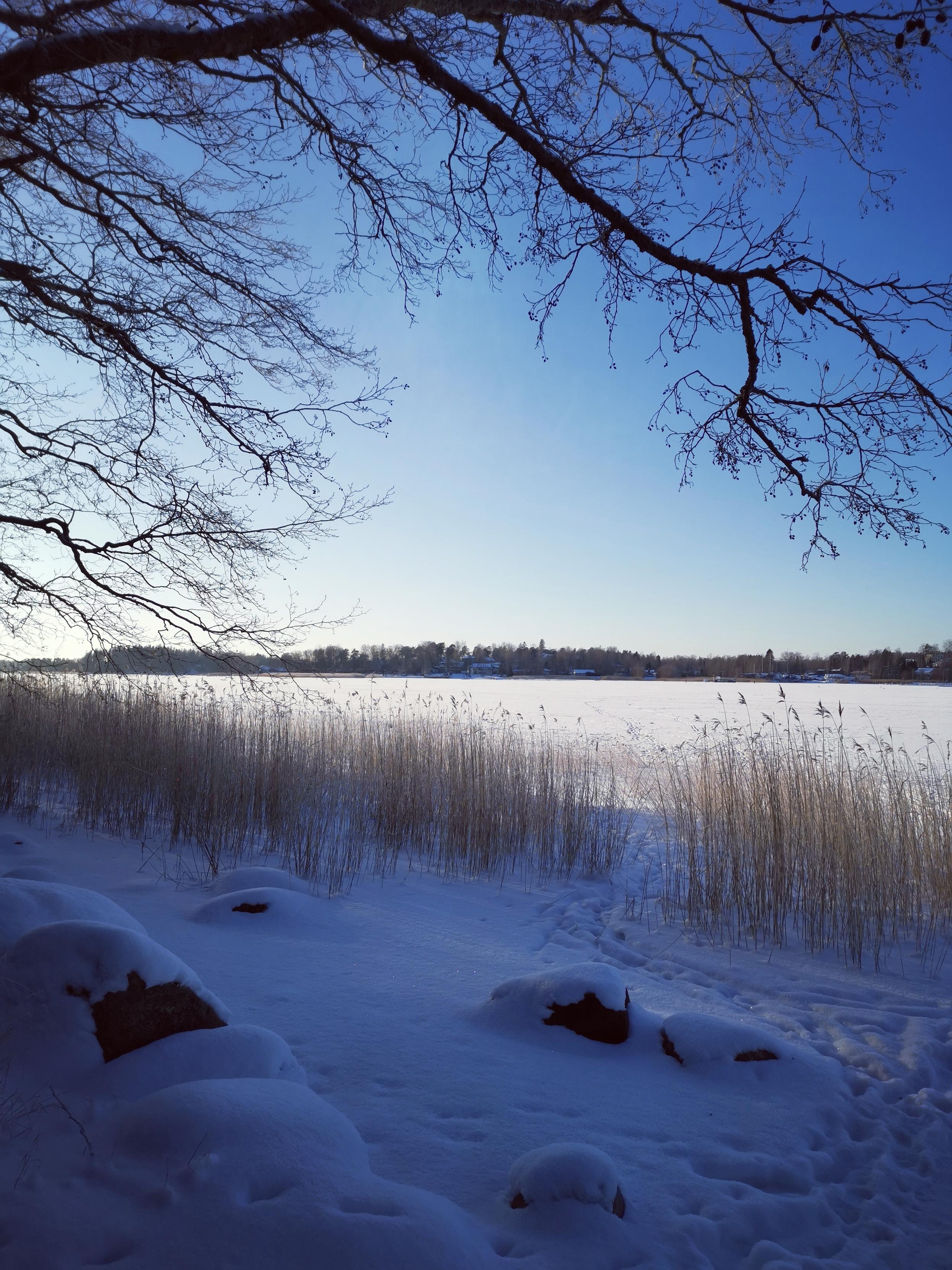 Näkymä lumiselta rannalta merelle, edustalla kaislikkoa ja yllä lepän oksistoa.