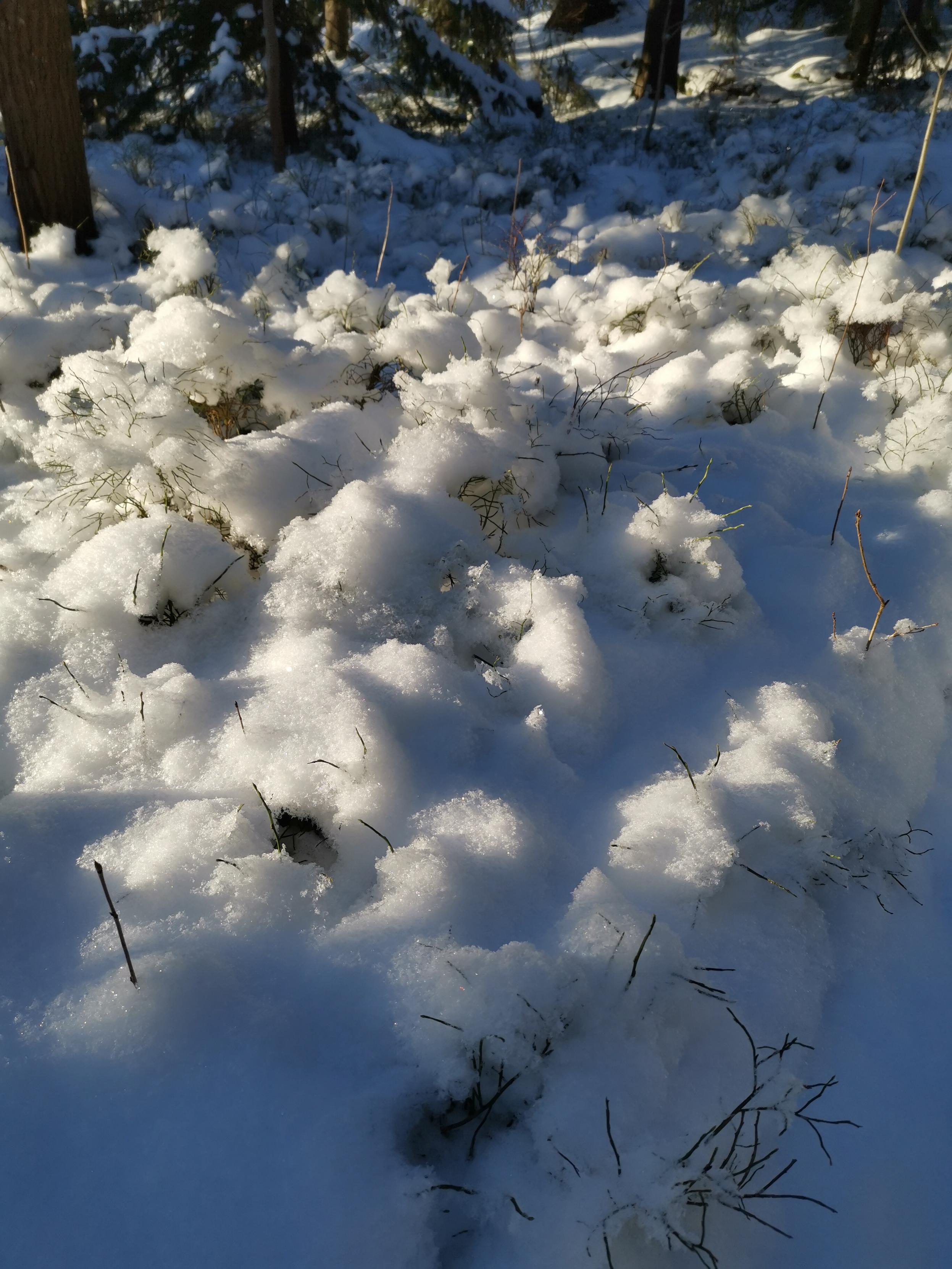 Metsän aluskasvillisuutta, joka on höttöisen kevyen lumen peitossa. Lumi näyttää etäisesti vaahdolta.