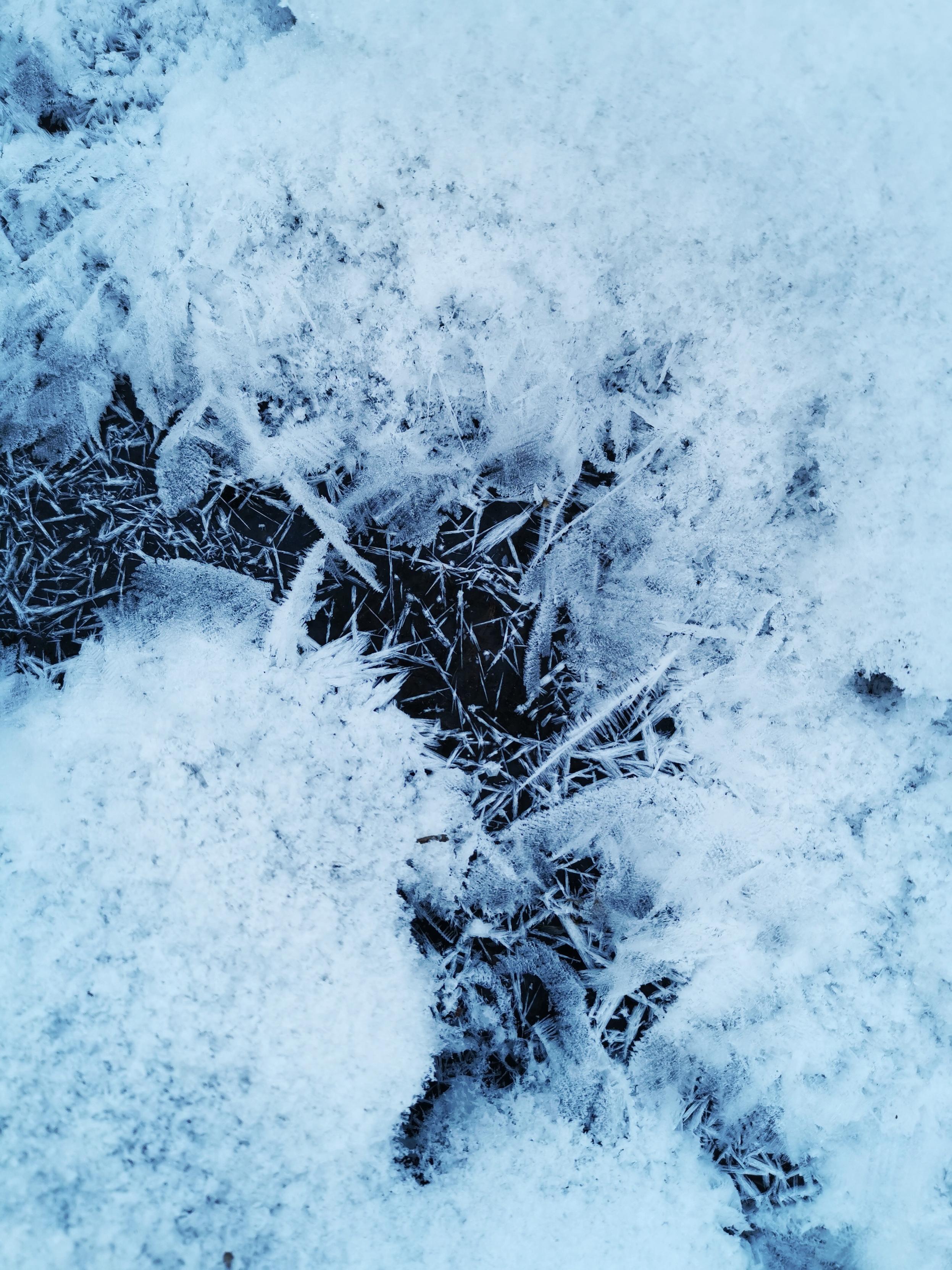 Jäätynyt puro, jonka pintaan on muodostunut valkoisia hileitä ja reunoille sulkamaisia jäähilemuodostelmia.