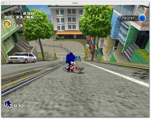 🕶️ A view of its IU (v.2.2 on Linux) with "Sonic Adventure 2", a 3D game featuring Sonic, as he rides down a San Francisco street on a helicopter metal plate, which he uses as a surfboard. 📚️ Flycast is a fork of Reicast, and a libre, multi-platform, single-player / multi-player (online) emulator of the SEGA Dreamcast, SEGA Naomi & Naomi 2 and SAMMY Atomiswave consoles. It supports 90% of Dreamcast games (both native and Windows CE), SEGA Naomi 1&2 games, state saves (savestates) and internal resolutions, VMU display (SEGA peripheral), making it one of the best SEGA Dreamcast emulators. It has its own compatible BIOS (BIOS HLE). You can also install the Dreamcast BIOS (files dc_boot.bin and dc_flash.bin, to be copied to ~/.local/share/flycast). Excellent!