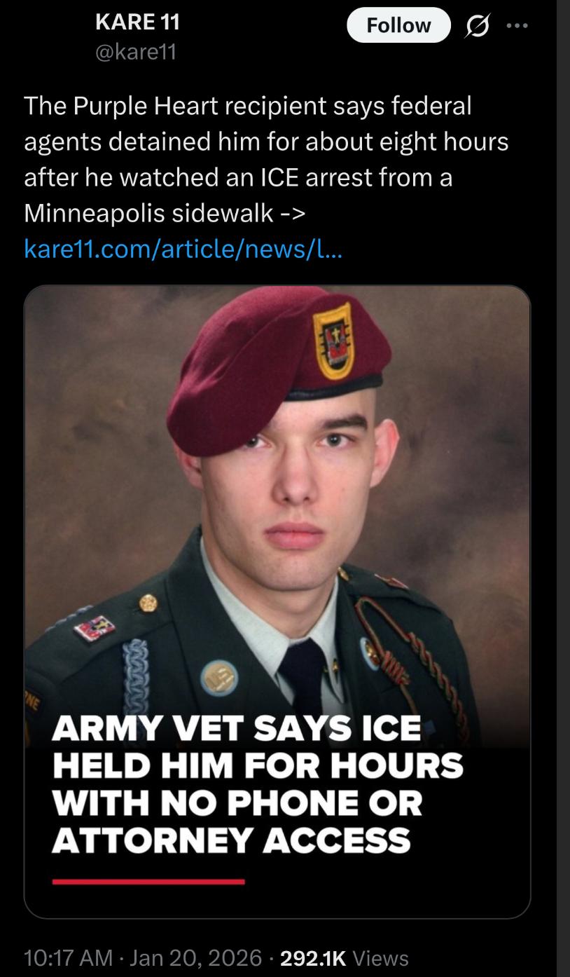 The Purple Heart recipient says federal agents detained him for about eight hours after he watched an ICE arrest from a #Minneapolis sidewalk ->