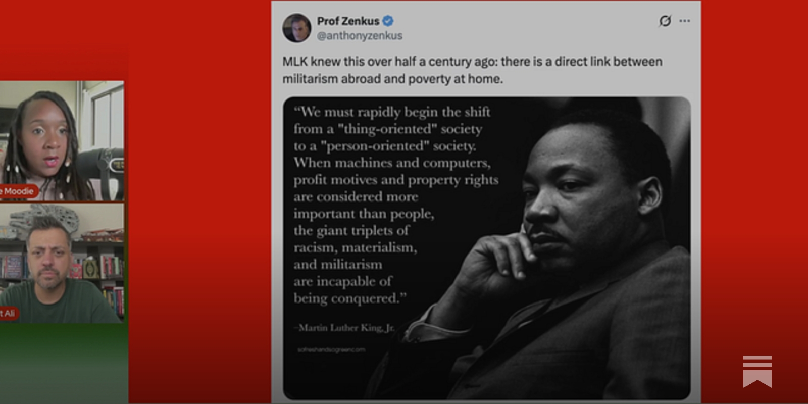 "I grew up in the white evangelical tradition. And the main thing I knew about Martin Luther King is that, yeah, he did the he did civil rights, blah, blah, blah, blah. But also he had a lot of affairs and he was very immoral. And that tells you all you need to know about the white evangelical tradition."