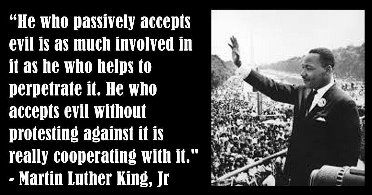 "He who passively accepts evil is as much involved in it as he who helps to perpetrate it. He who accepts evil without protesting against it is really cooperating with it." - Martin Luther King, Jr.