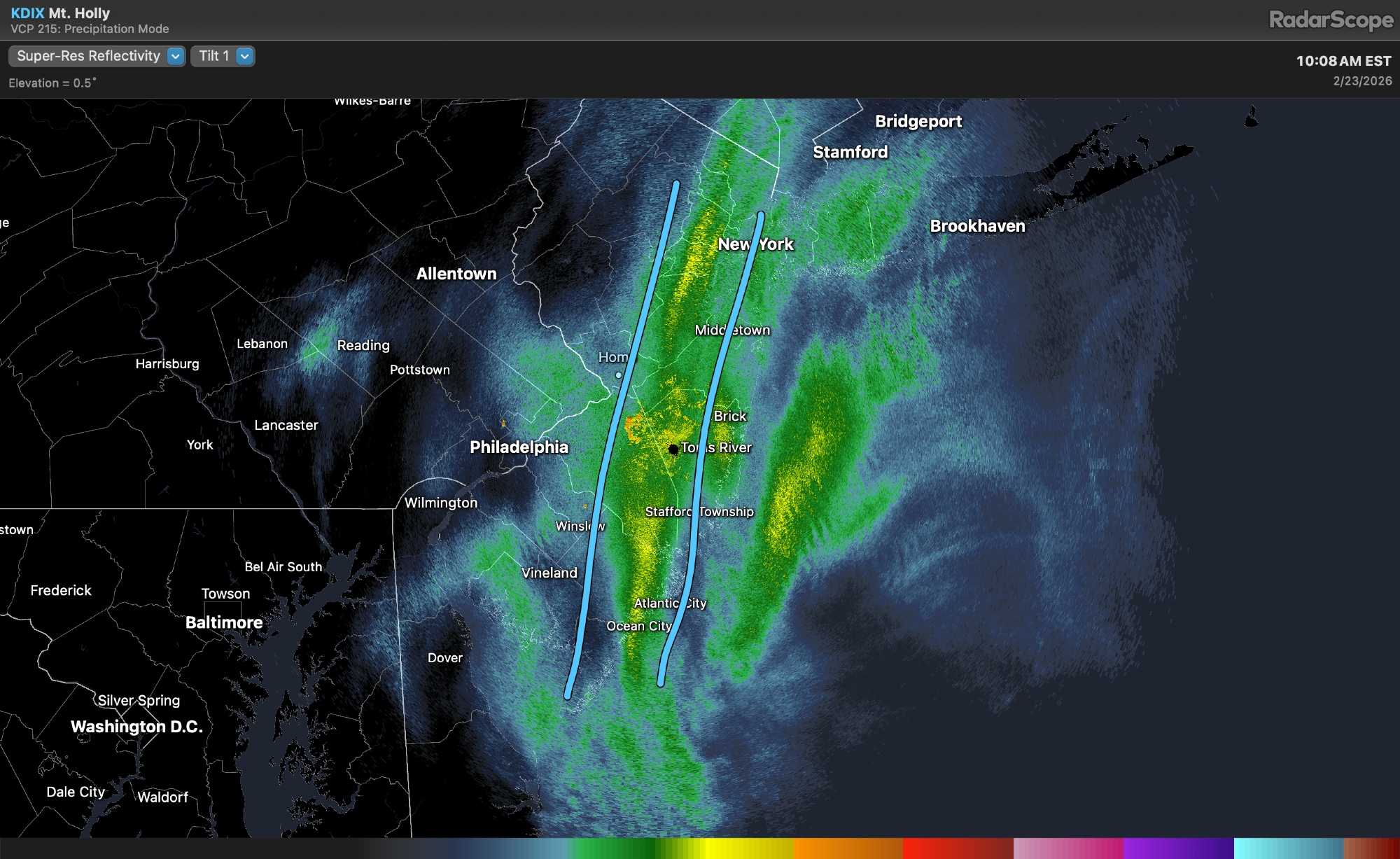 This band setting up right down the middle of New Jersey is looking pretty damn impressive. I might get in on the western fringes of it for awhile. Anyone just under 24" in the path of this is going to get their two feet of snow. #njwx
