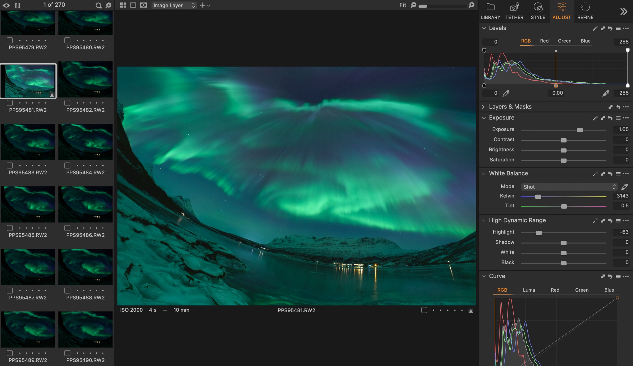 What colours are real? The camera is seeing a lot more colour than our eyes do. We did see the red and greens in the night, for sure. At times the sky was like daylight, but green and red. If you tinker with white-balance you can push those reds into purple, and the brighter greens into yellow hues. Reality is anything you want it to be on a night like this.