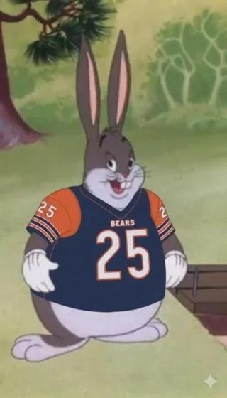 A cartoon rabbit wearing a Bears football jersey with the number 25, standing outdoors with trees in the background.