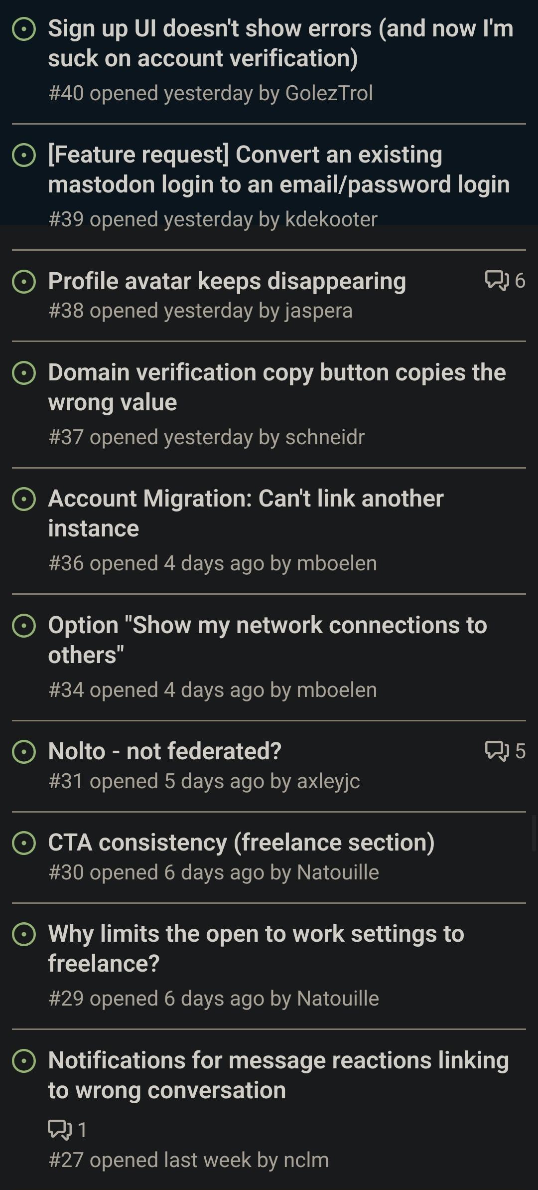 #nolto (link) is a new federated professional network where federation happens through ActivityPub. Like LinkedIn (🤮) but inside the fediverse. Not sure if that's a good thing or a bad thing, but so far the feed is actually readable and has only ~0.1% of the typical LinkedIn garbage. You can create the account and log in with your existing Fedi profile and it's possible to import stuff from LinkedIn (it works, just checked) You can also delete your account there or request your data. It's open source and the code resides in Codeberg.