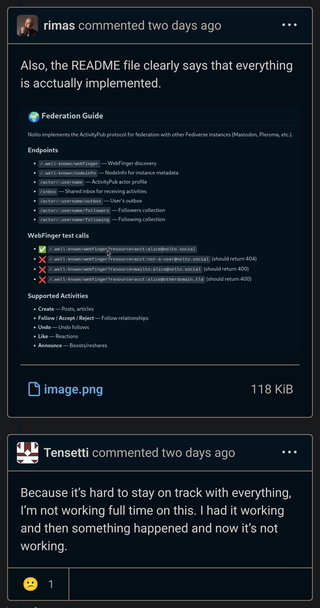 Judging from the Codeberg issues [1] and the self-professed ignorance of the prompter about fundamentals of federation and software dev [2], it seems highly likely that Nolto is vibe-coded