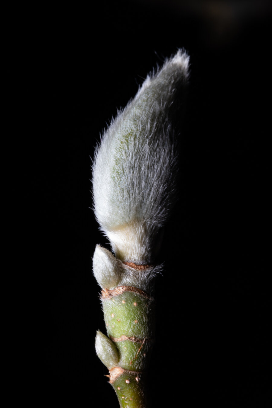 A photo of the end of a budding branch. Gray fuzzy pod, that I think is pussy Willow, but I’m probably wrong. There is a green stem and two tiny gray pods growing below the main pod. Dramatic flash lighting so one side fades to black.