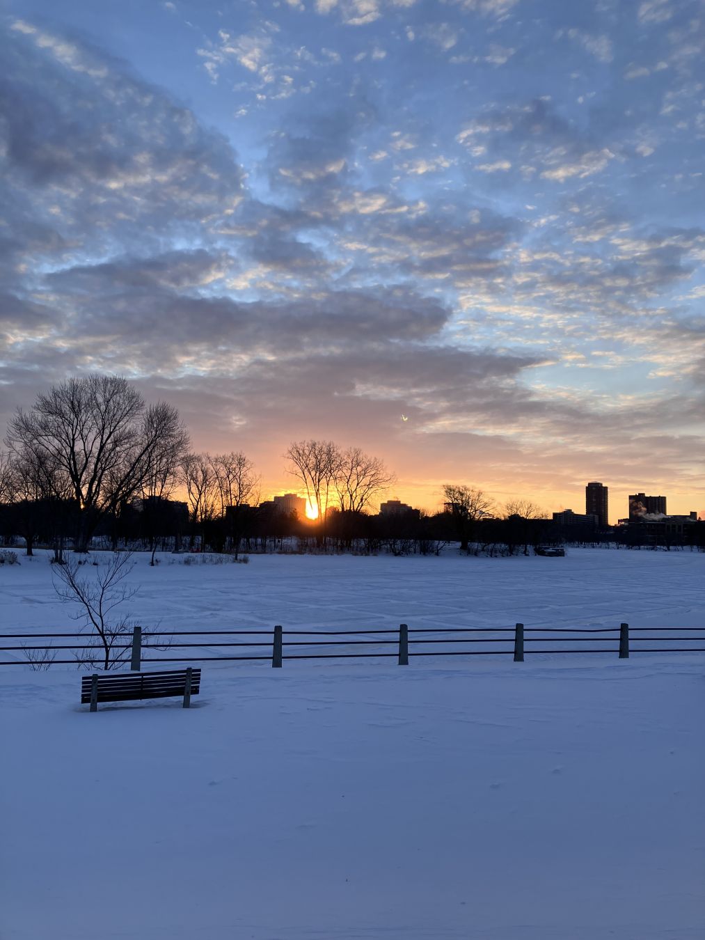 Sun through buildings and trees at dawn - look at those cloud patterns!