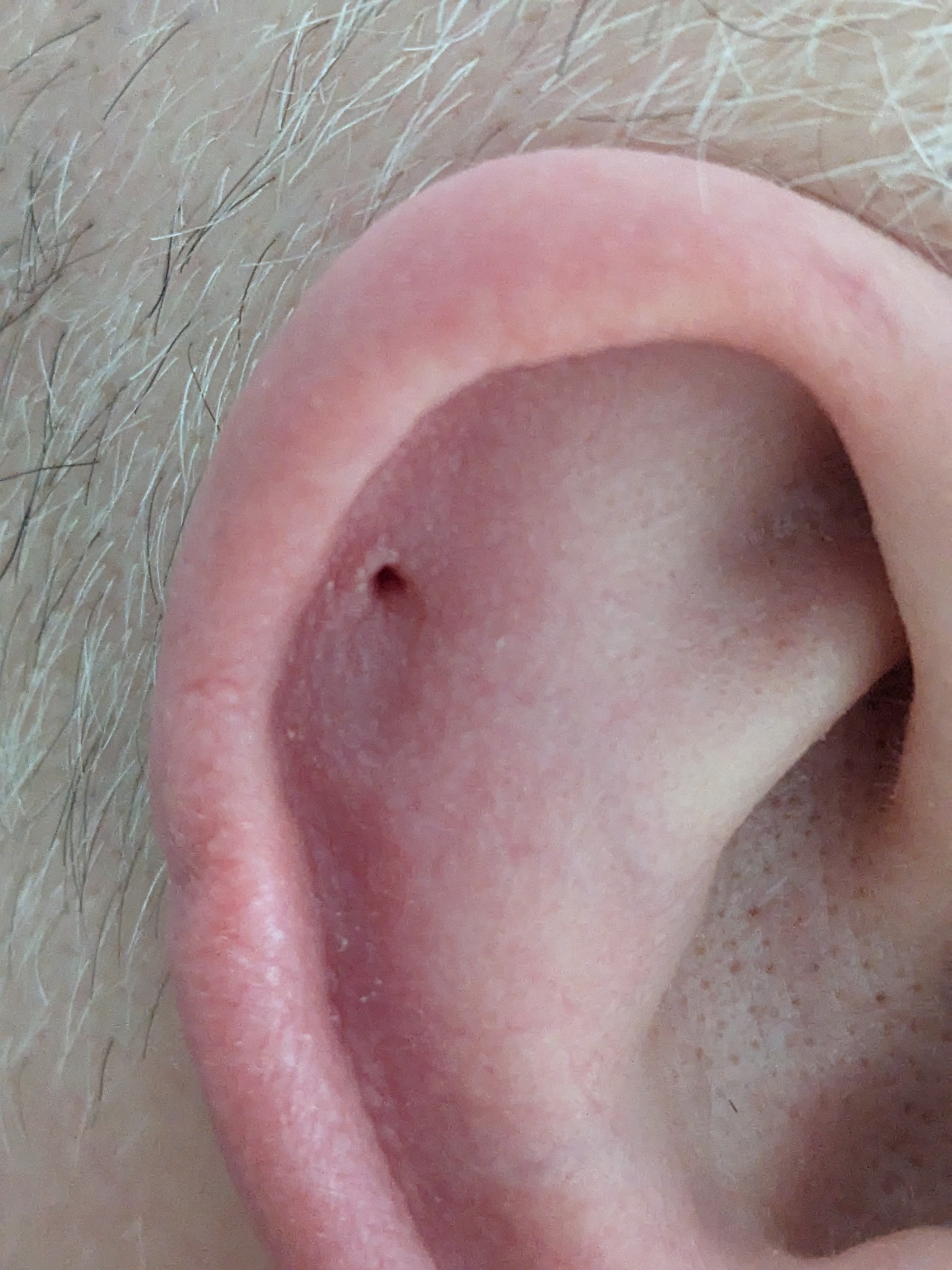 My ear, and the hole where my helix piercing has lived for the last sixteen or so years. This one's not going back in, but the other loops will.
