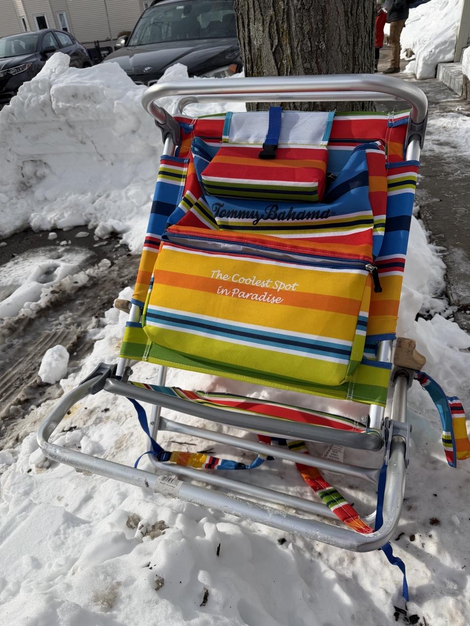 “The Coolest Spot in Paradise.” Space savers standing by in Dorchester. #boston #snow #streetscape