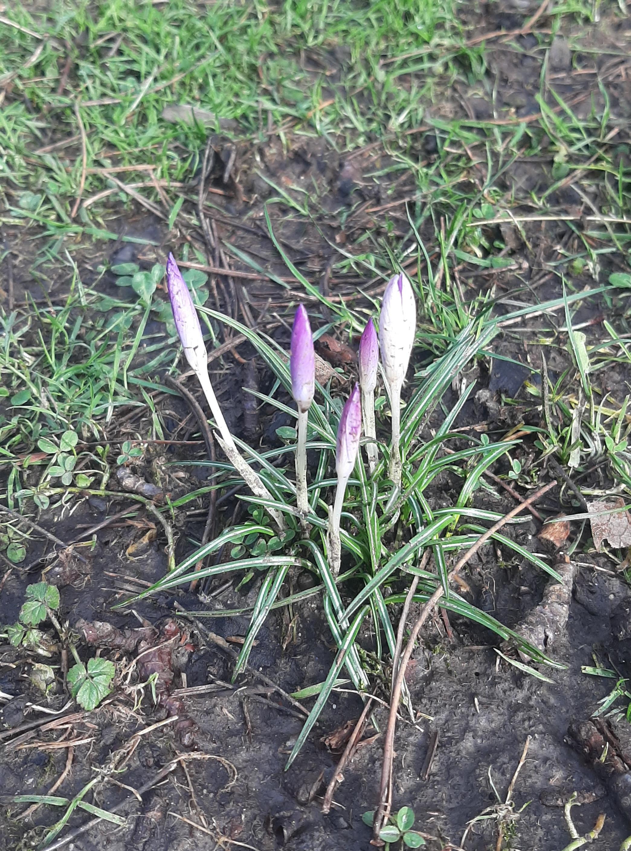 Close up photo of a bunch of small purple flowers, possibly crocuses, just about to bloom, growing in mucky ground.