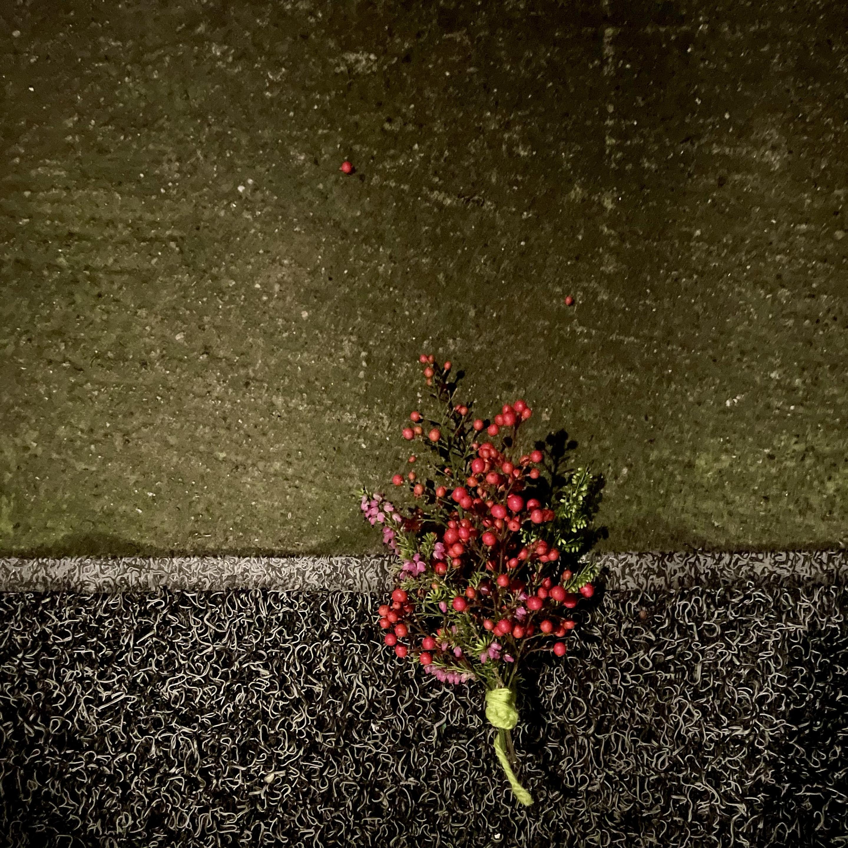 A small bouquet of red berries and green foliage is resting on a textured surface of a doormat and the green grey of a cement pavement.