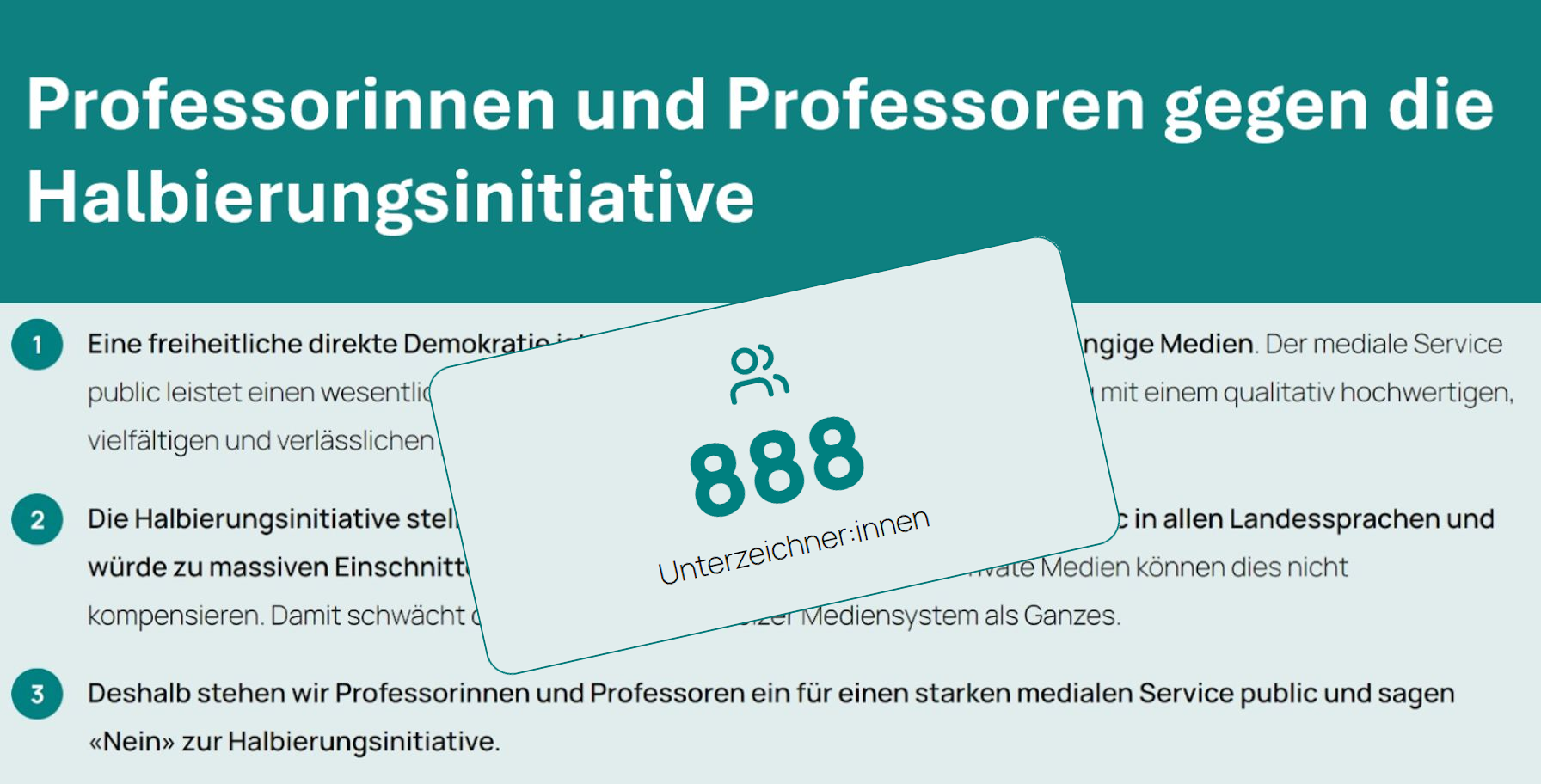 Bereits 888 Professorinnen und Professoren aus allen Sprachregionen und Disziplinen setzten sich ein für einen starken medialen Service public und gegen die SRG- #Halbierungsinitiative!