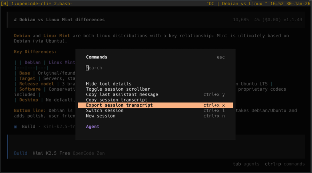 2) OpenCode has a convenient feature to export chat logs (in a nice, git-friendly Markdown format). Awesome I say! See Screenshot; the feature is called "Export session transcript" (shortcut: ctrl+x x). Avail yourself of it, my dudes!