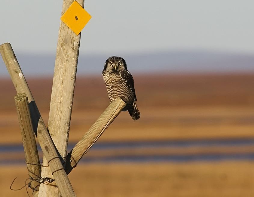 Northern Hawk Owl on an Iditarod trail tripod marker.
