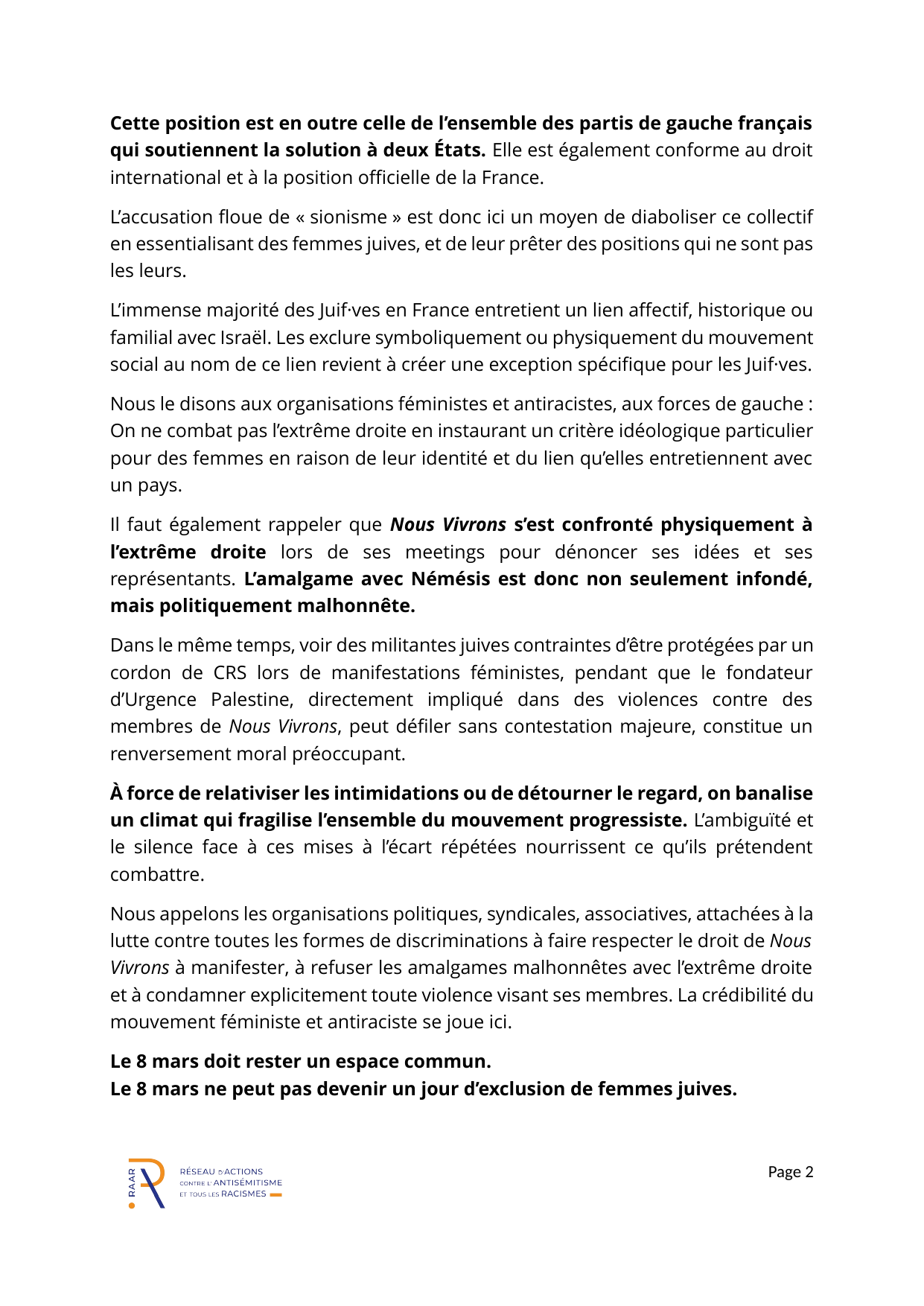 Des appels ont explicitement refusé de manifester en présence de « sionistes », qualifiés de « fascistes », visant en réalité ce collectif de femmes juives et l’assimilant au groupuscule d’extrême droite Némésis. Cette comparaison ne relève pas du débat politique, mais de la stigmatisation.