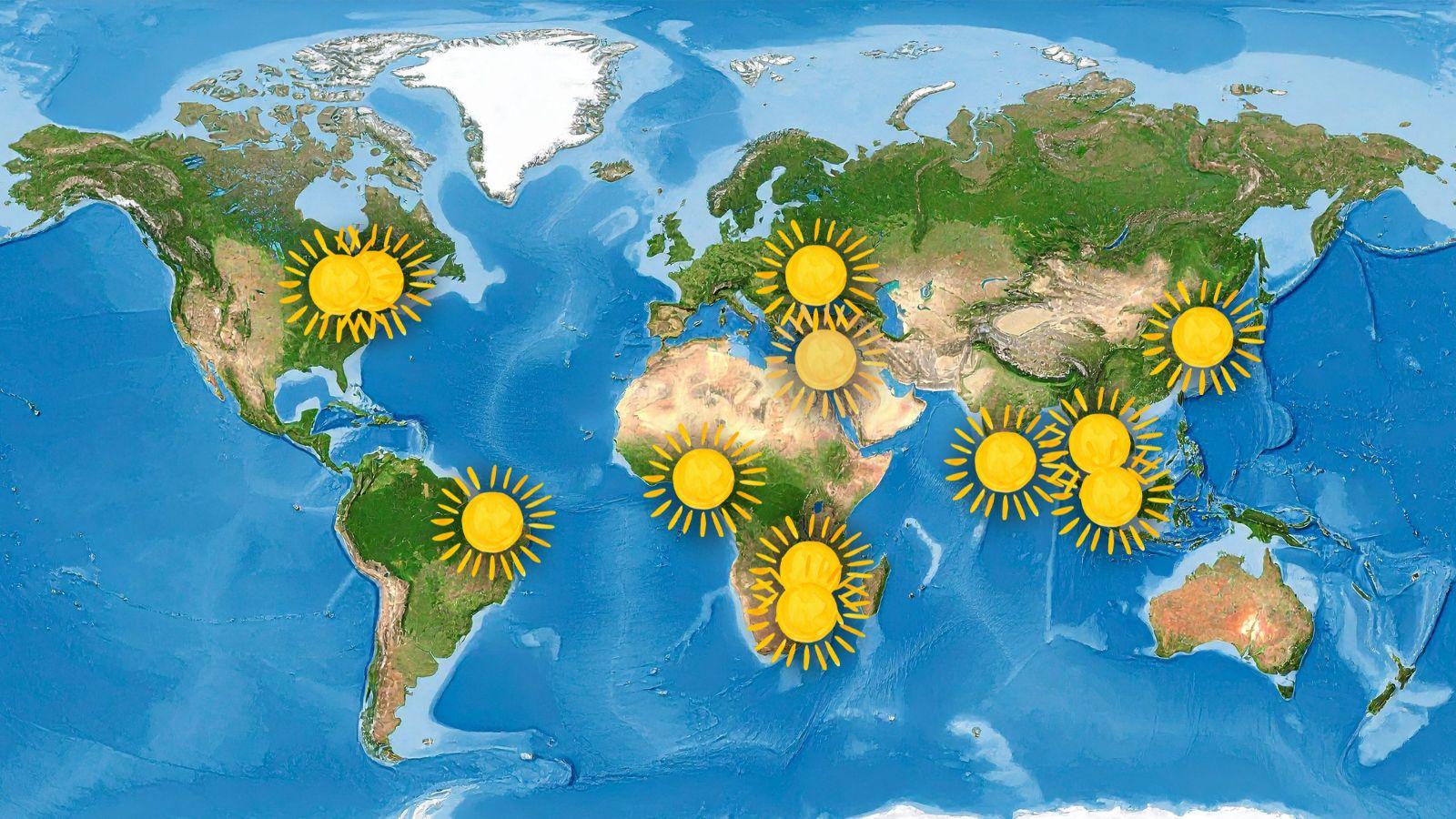 Shows 12 sunshines over a map of the Earth, in the Americas, Western Europe, SWANA, Africa, and Asia.