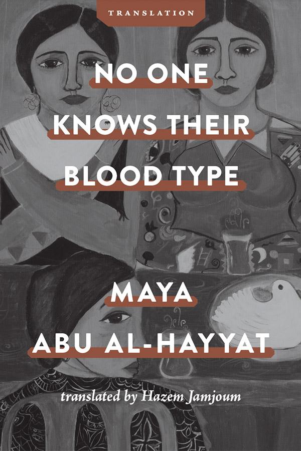 Cover to No One Knows Their Blood Type by Maya Abu Al-Hayyat translated by Hazem Jamjoum, three unsmiling femme figures seated at a table.