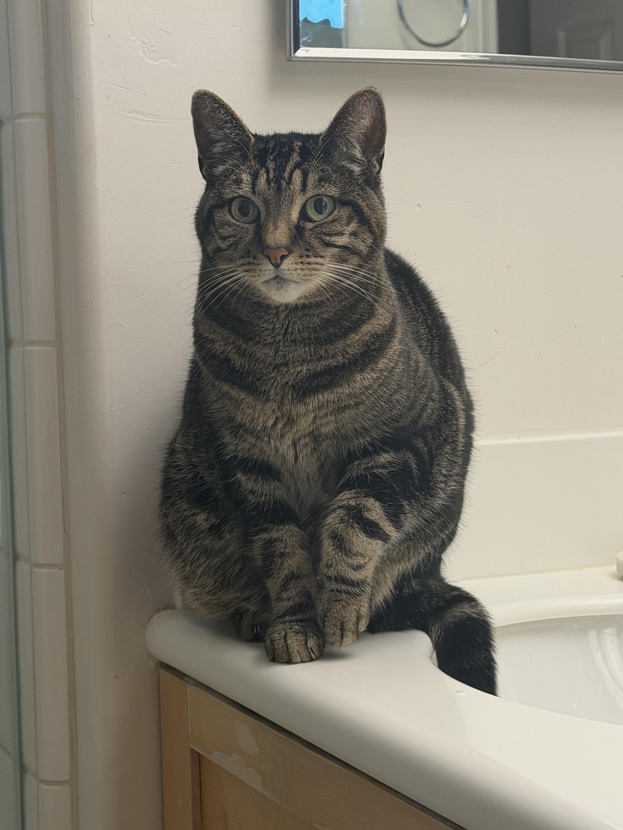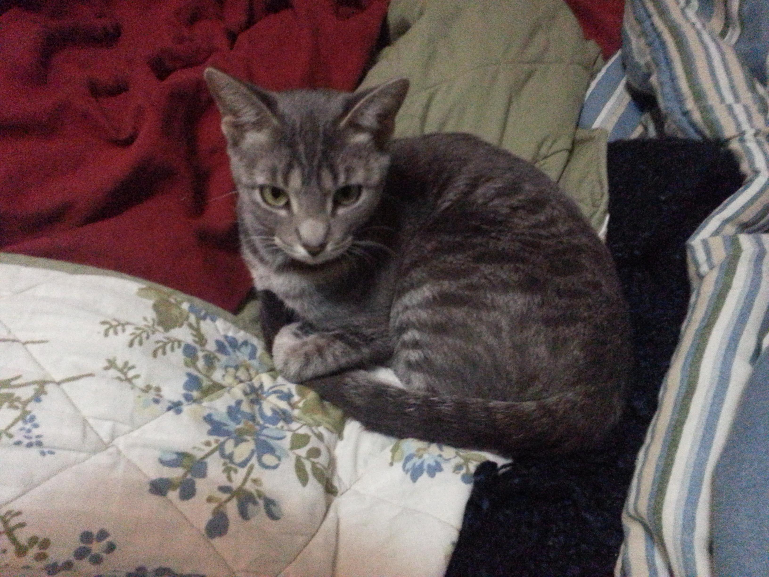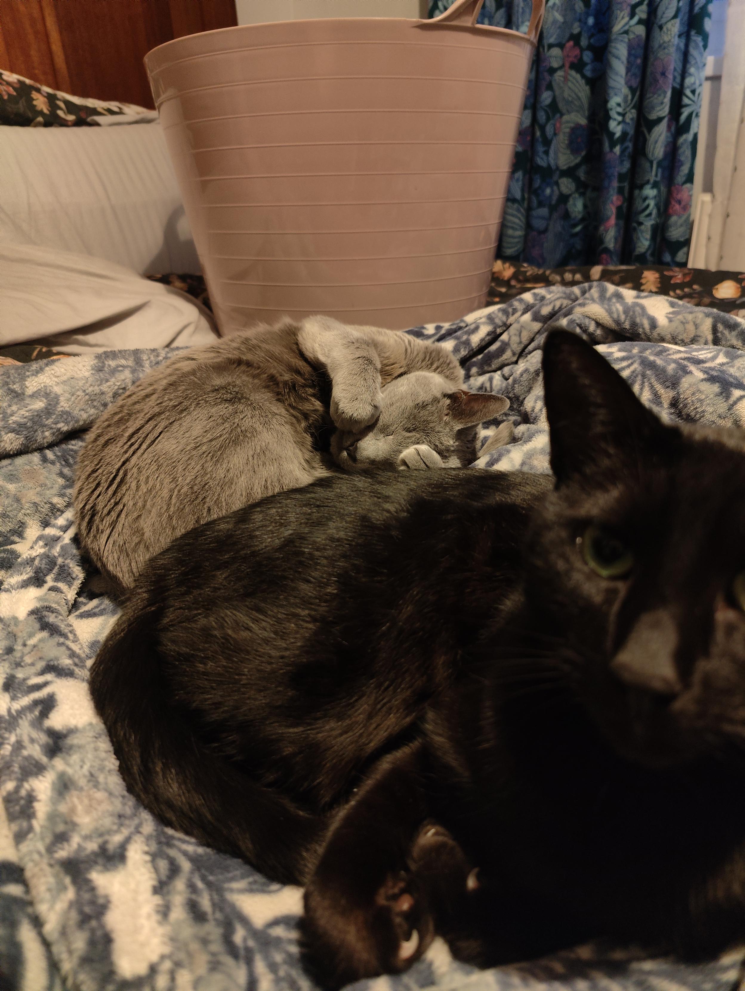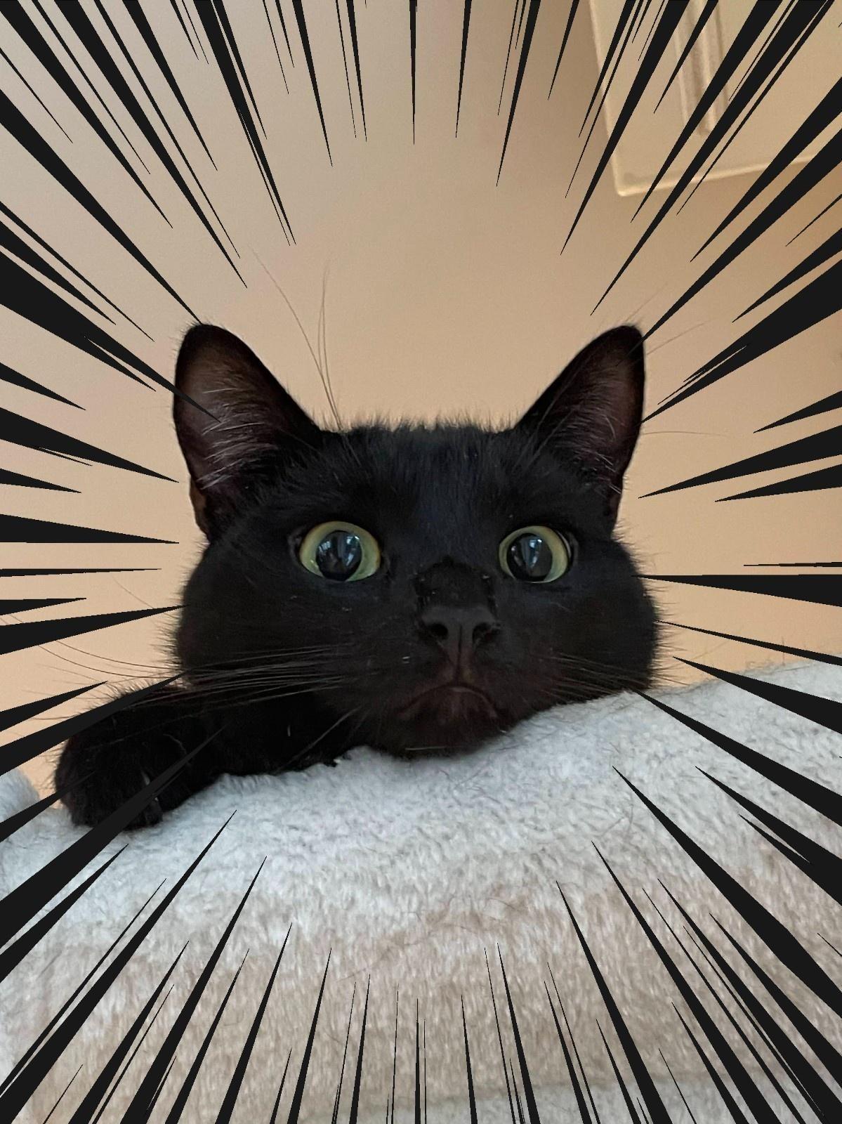 The top of a cat tower is framed by a large kingdom hearts 3 poster in the background draped over some noise canceling foam. The top most platform of the cat tower has a black cats face peeking just over the edge. Her eyes are closed as she is sleeping. Her face slightly squished by the cushion. Making her chin fur pudge up so she has the appearance of a grumpy older person frowning about something. Probably annoying kids. But she is in fact a very cute kitten and happily snoozing.