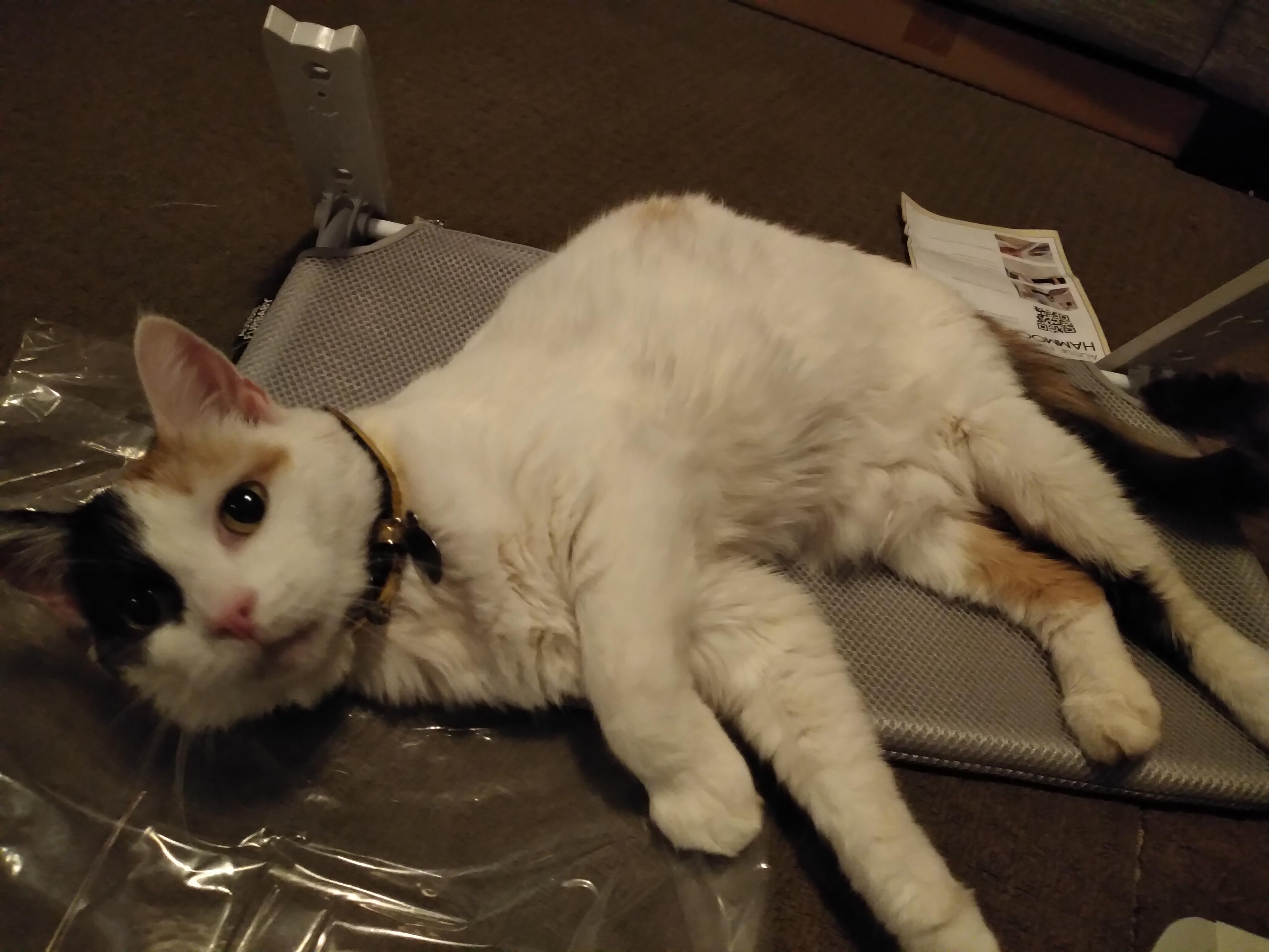 A scene of a slightly messy floor. Some boxes of cat food and energy drinks to one side a pillow on the other edge. In the center a pair of backpacks lay flat with a large black cat flipped on its back stretched out over them. Shes comfy and happy. Back arched, arm stretched out as she playfully wiggles around on top of the backpacks.