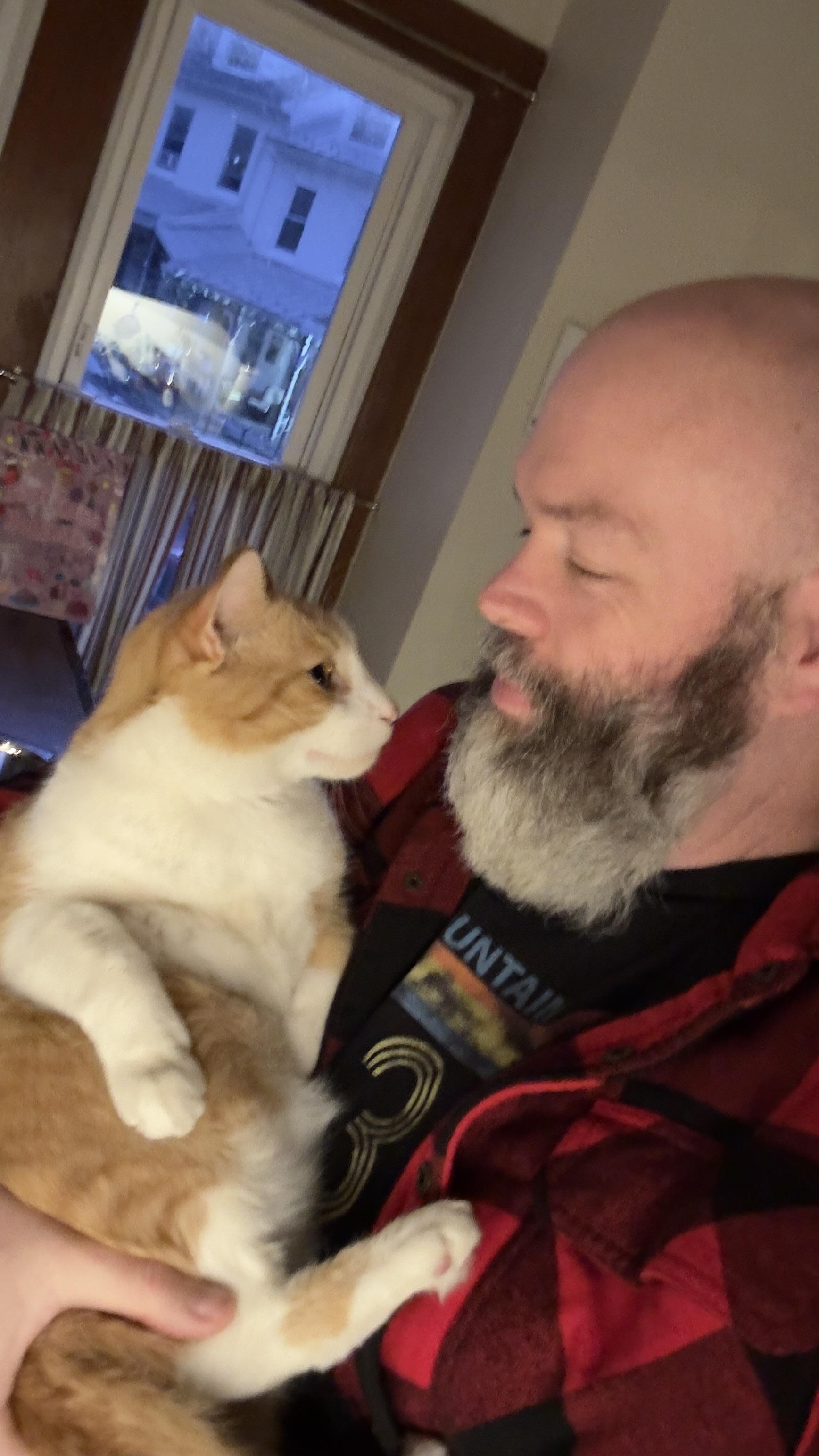 Middle aged man with shaved head and salt and pepper beard looking lovingly at his pudgy, confused Orange and white kitty.